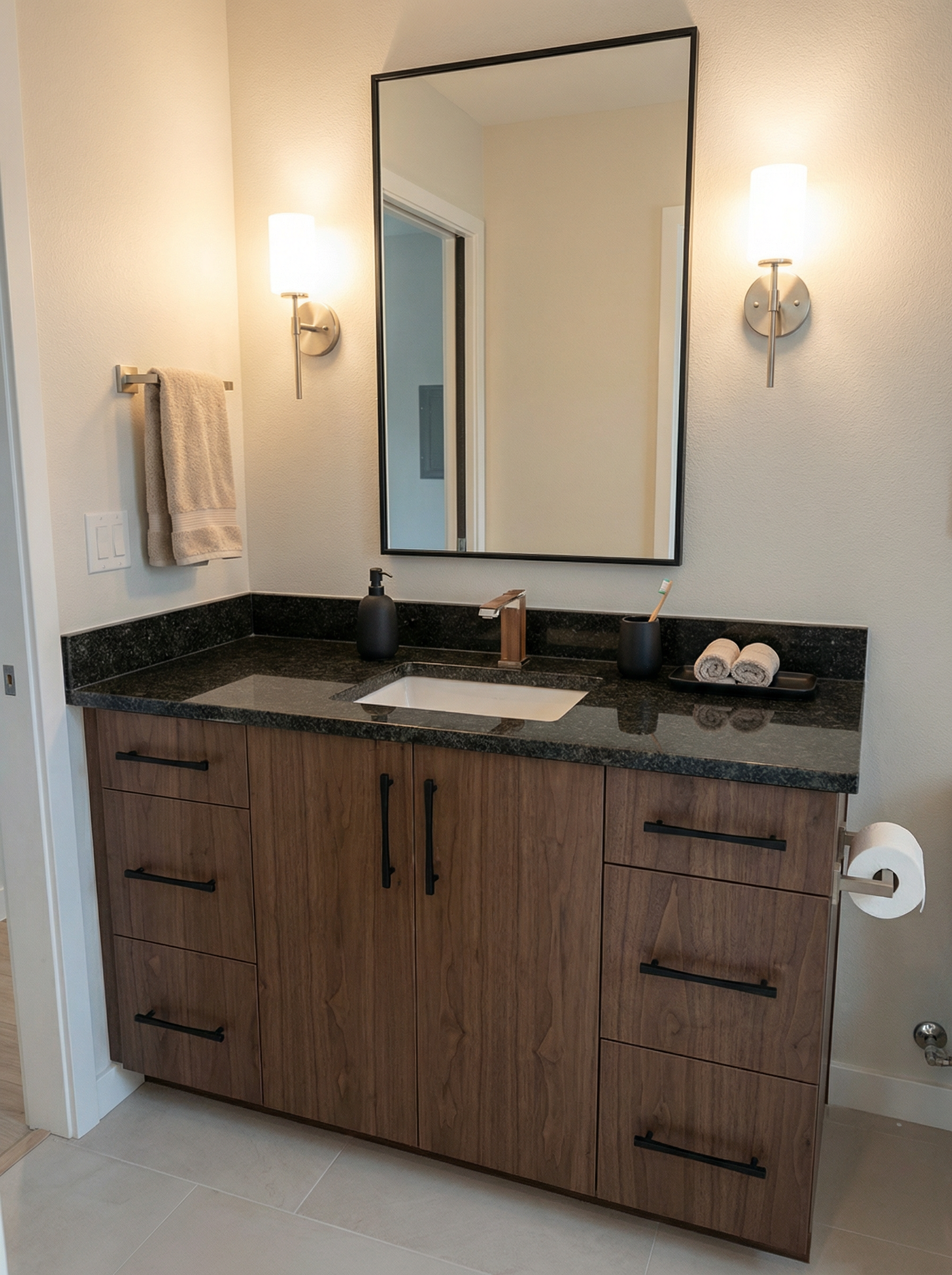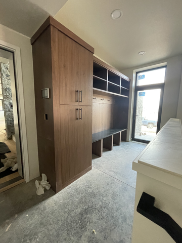 do not change the cabinets in any way preserve the exact cabinet colors materials finishes dimensions door and drawer styles hardware spacing alignment and all geometry exactly as shown do not alter the countertop shape backsplash appliances flooring lighting fixtures or wall structure only remove the construction materials clutter and mess from the scene clean the room and make it look finished and staged add a few simple tasteful home accessories appropriate for the style of the space but do not add or remove any furniture windows or architectural elements maintain the original lighting direction and realism enhance clarity and polish the photo while keeping the cabinetry and room design completely unchanged do not alter the lighting to keep the cabinet colors as they are in the image remove the white cooler image on the right add new flooring a nice view out the door stage for a mudroom