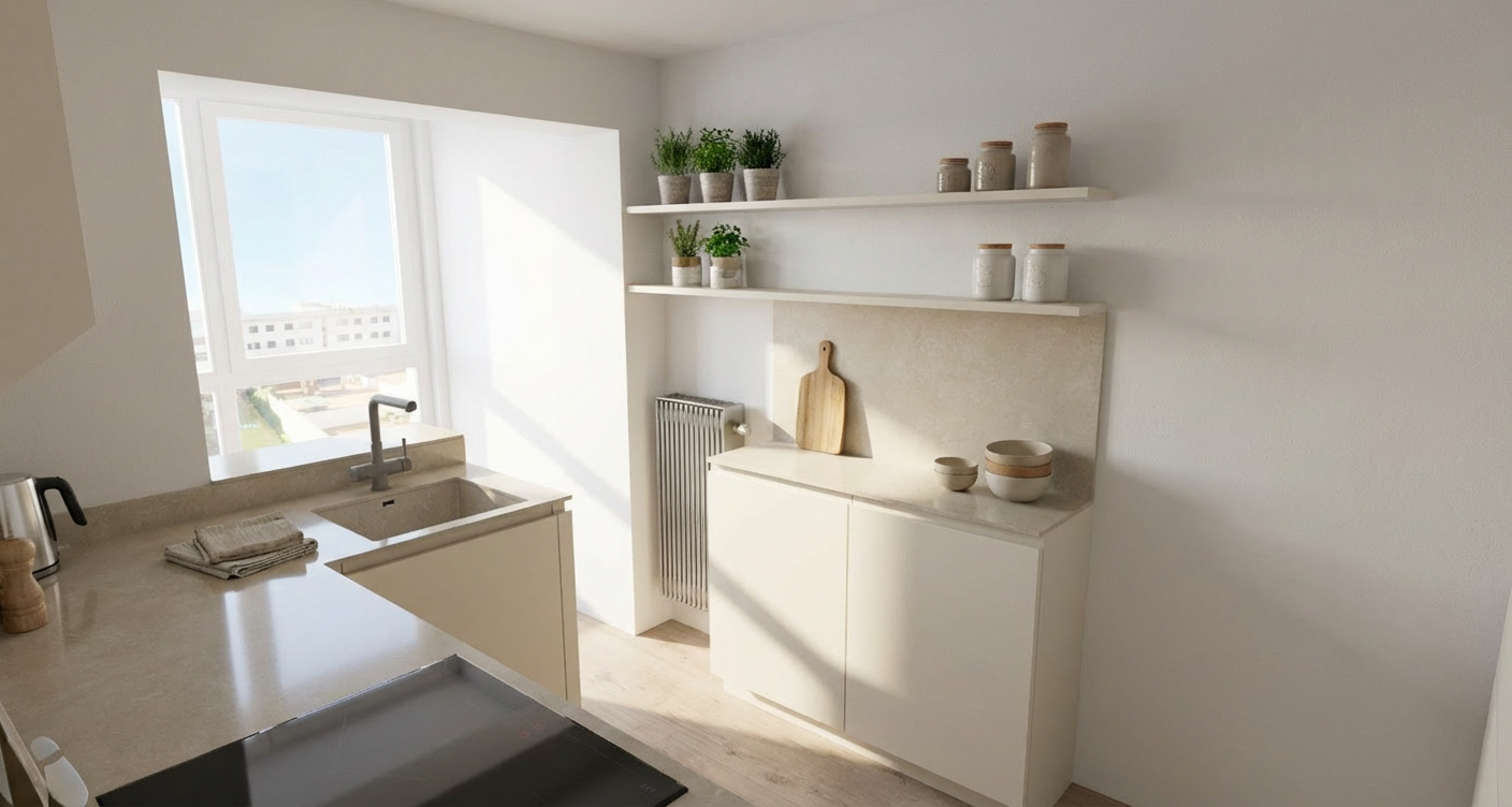keep everything exactly the same in the rendering do not change the layout walls windows doors vanity fixtures shower walls or main floor tile only make the shower niche in the shower the size of the highlighted red box everything else should remain exactly the same do not add anything new