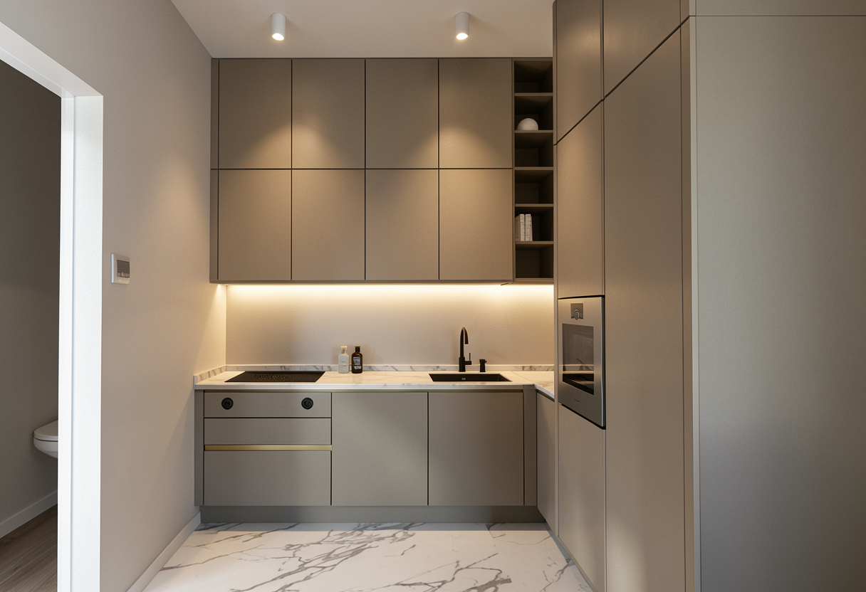 camera con letto matrimoniale in tessuto di cotone bianco caldo non ci sono strip led che illuminano la stanza a destra dell ingresso c una cabina armadio in legno rovere naturale con delle strip led sopra al tubo appenderia a sinistra ci sono la lampada da tavolo e la lampada parentesi di flos accese tra le due lampade c un quadro la tenda pesante di colore beige chiaro fai entrare un p di luce naturale dalla finestra e metti uno sfondo di un terrazzo con delle piante e vista mare in lontananza metti qualche oggetto su letto e metti vestiti e accessori nella cabina armadio