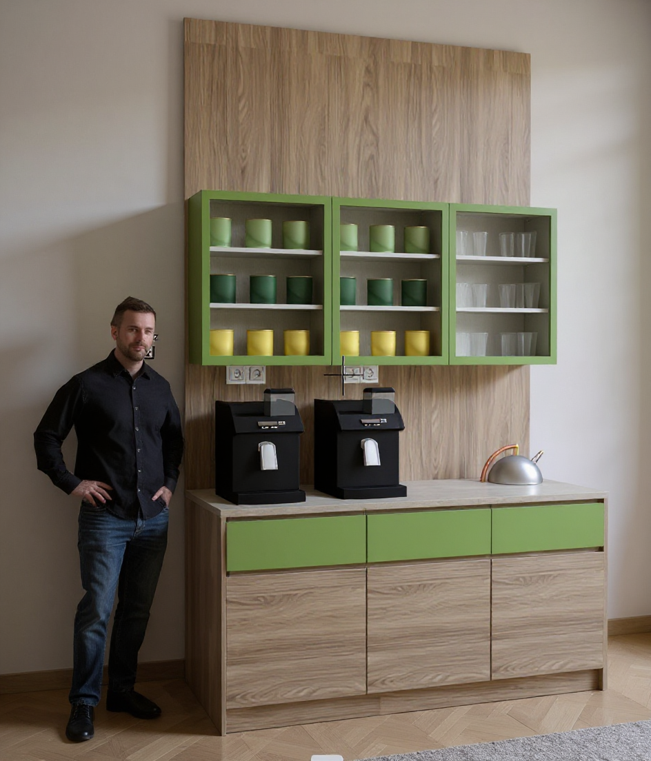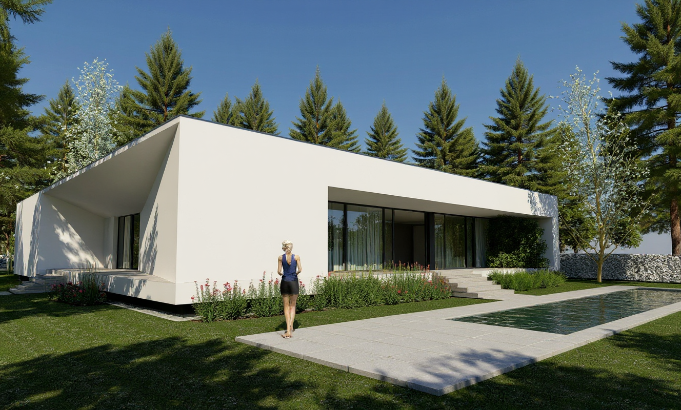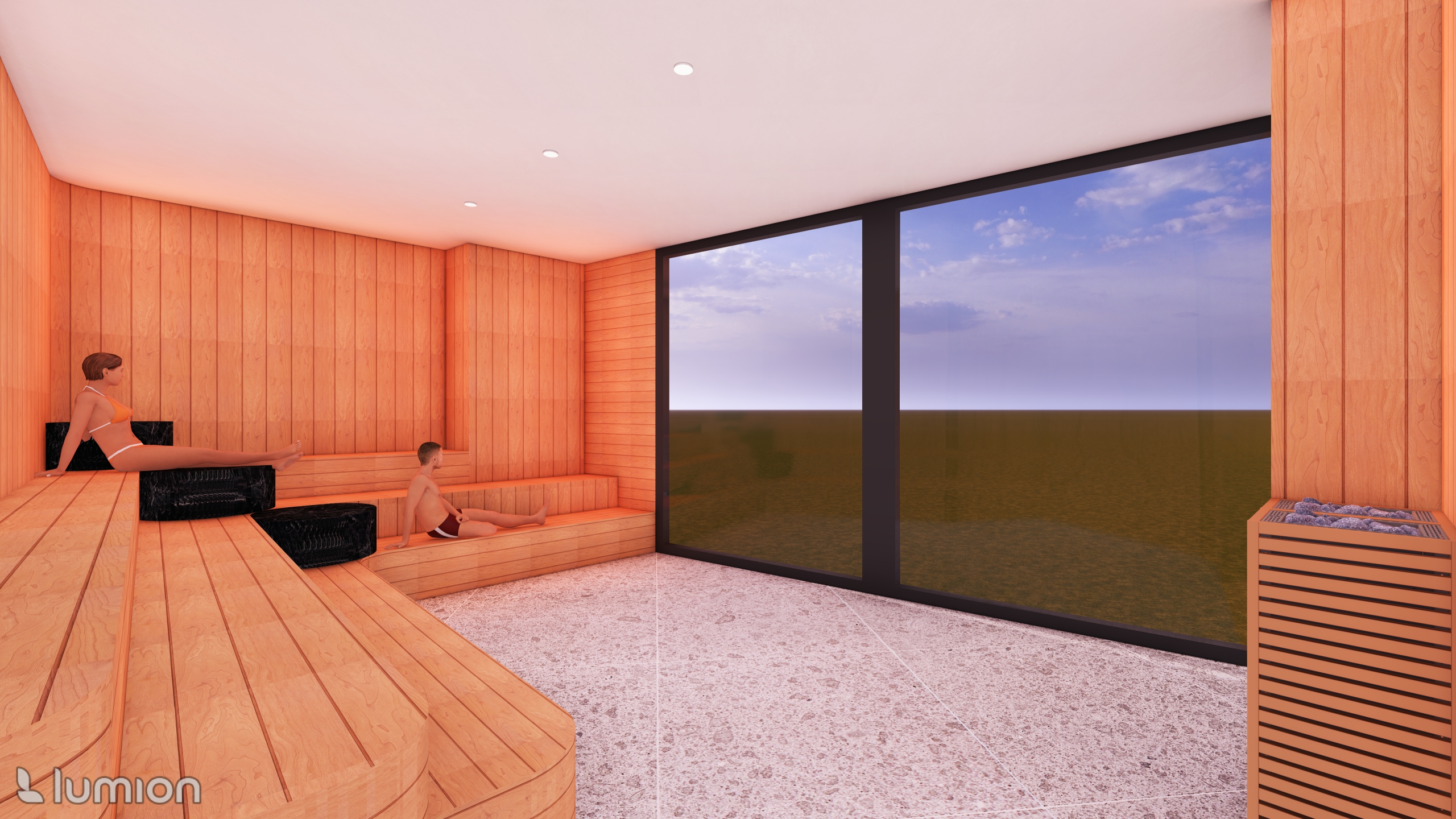 a warm contemporary unisex sauna interior rendered in high quality 3d maintaining the soft amber tones of the timber cladding and the natural warm glow of the lighting the space features smooth wooden wall panels tiered rounded bench seating and textured stone flooring two people sit and recline on the benches adding scale and atmosphere a large floor to ceiling glass window opens to an expansive view of the landscape with the sydney cbd skyline visible in the distance against a soft blue sky a modern sauna heater filled with stones sits near the glazing the overall scene feels calm minimal and spa like with accurate colour warmth and realistic reflections on the glass