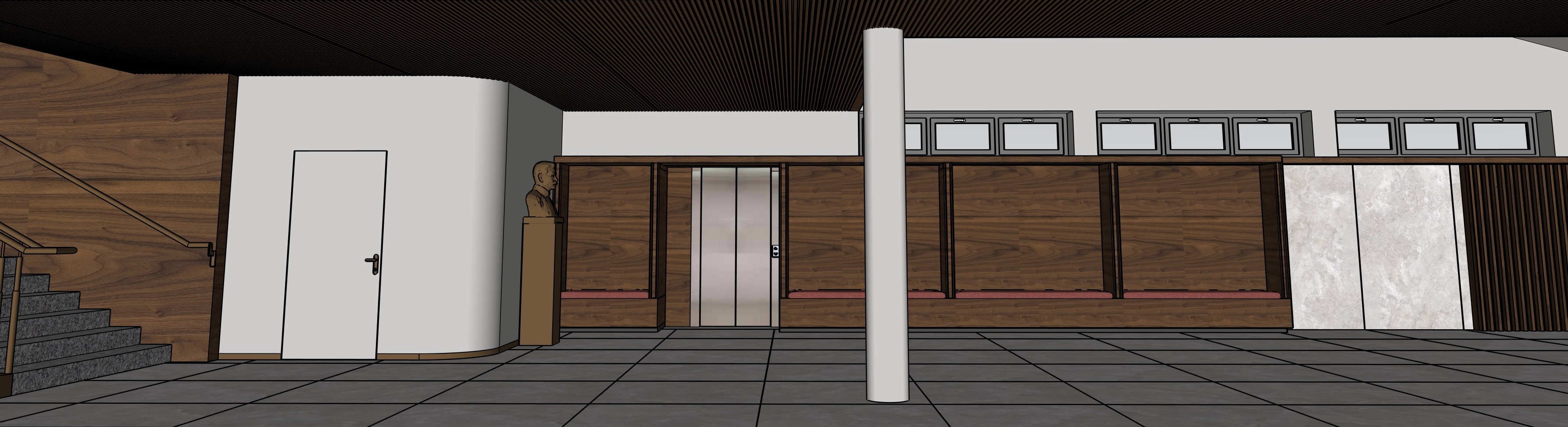 modern cultural building foyer interior warm light from windows elegant people people also in front of picture light interior matte floor led between ceiling slats inox elevator door bronze bust hidden led light in wooden frames