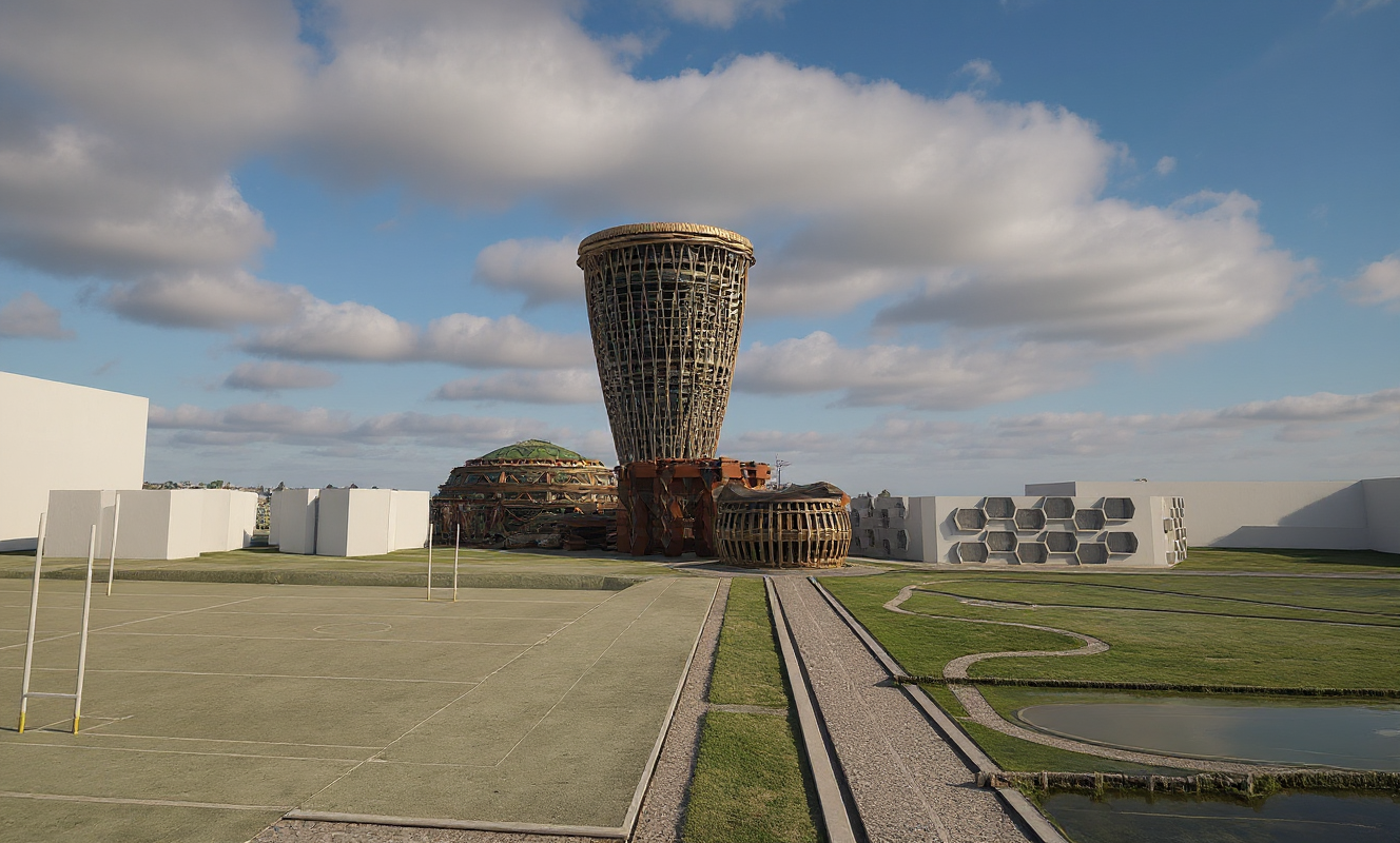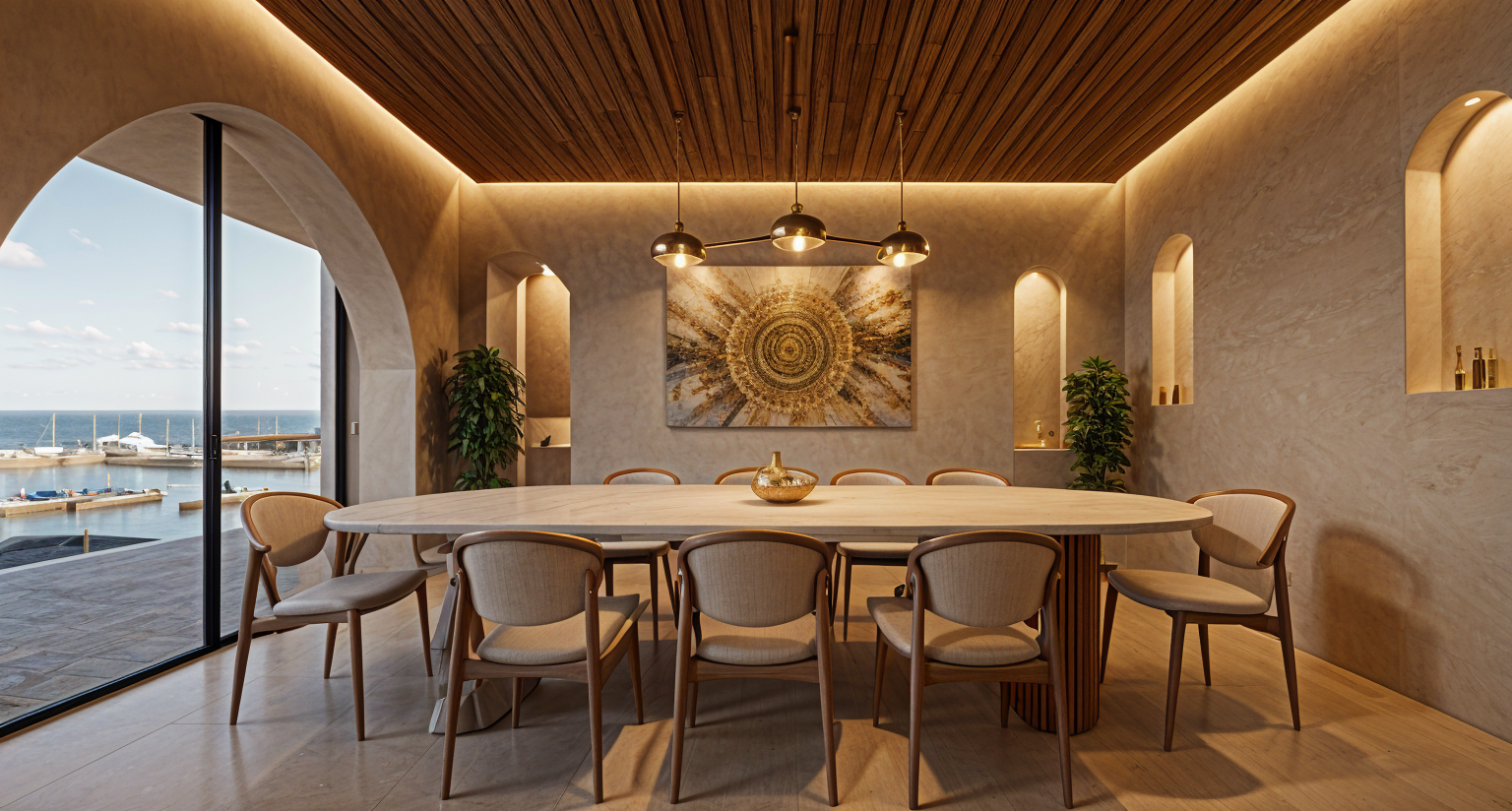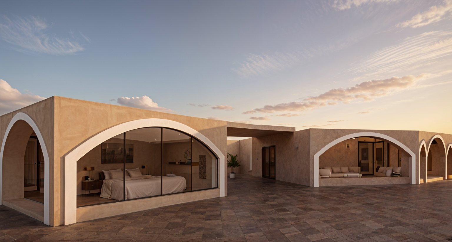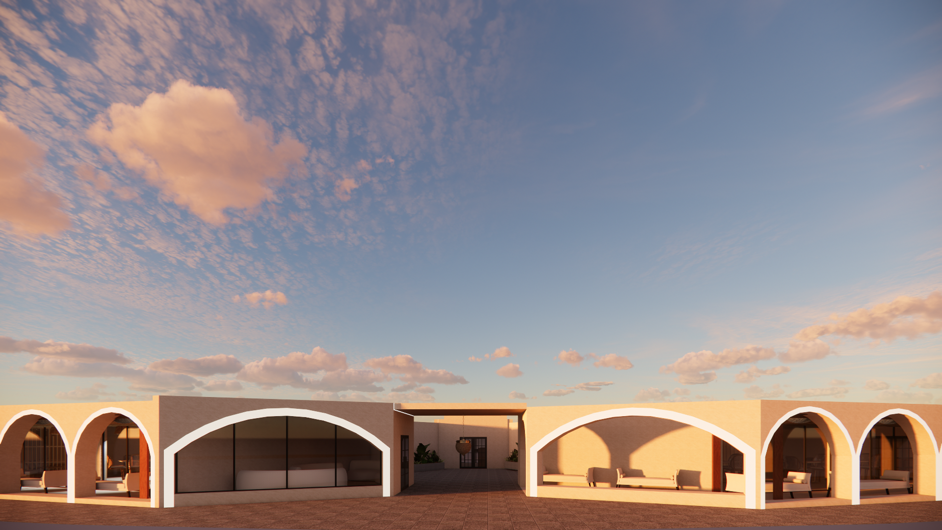 render a beautiful architectural courtyard with a series of elegant arches the building has light beige stone walls and white arch accents large glass windows reflect the soft golden sunlight creating a warm and inviting atmosphere inside the arches there are comfortable seating areas with cream cushions the sky is expansive painted with a gentle gradient from light blue to a rich pastel pink fluffy clouds are lightly tinted with shades of soft pink and orange setting a serene and peaceful mood in the evening light architecture