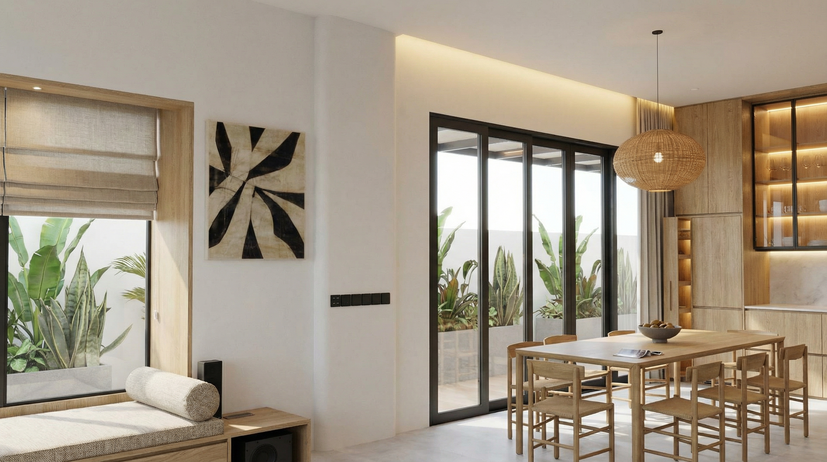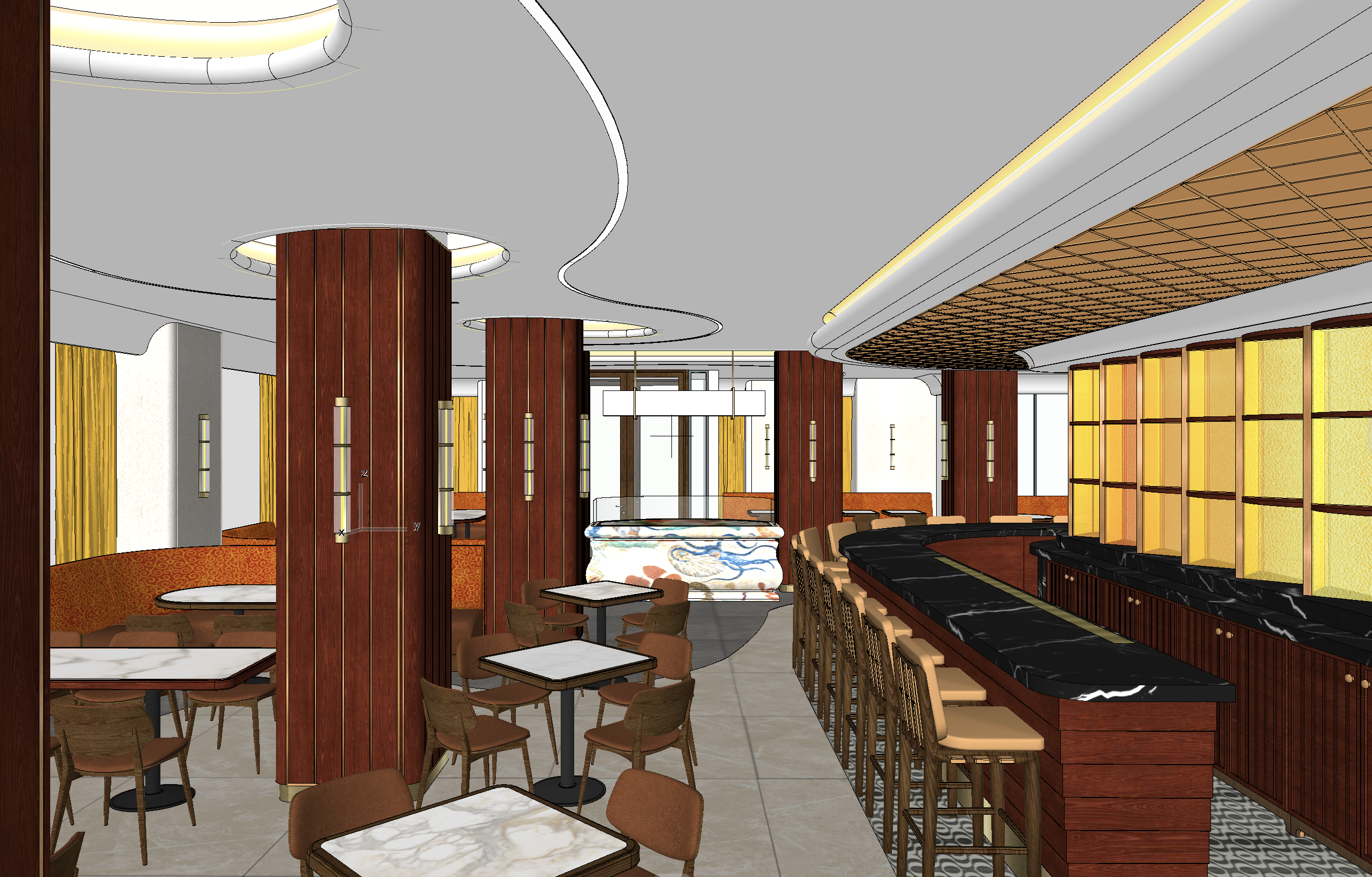 ultra realistic restaurant interior video same camera angle slow smooth camera motion bright daytime natural light fills the space all lighting is warm 2700k led cove lighting in the ceiling niches and in the niches above the yellow curtains creates a soft warm glow ceiling features rounded recessed cut outs around columns with curved trim and internal lighting bar ceiling section finished with mirrored yellow reflective tiles amber glass bar panels and fully stocked bar with alcohol bottles and glassware palisander wood columns with brass inlays black marble bar counter orange patterned velvet banquettes marble tables caramel leather chairs add lively atmosphere tables fully set with plates glasses napkins guests chatting bartenders preparing drinks waiters serving tables gentle motion in curtains and reflections photorealistic warm vibrant mood