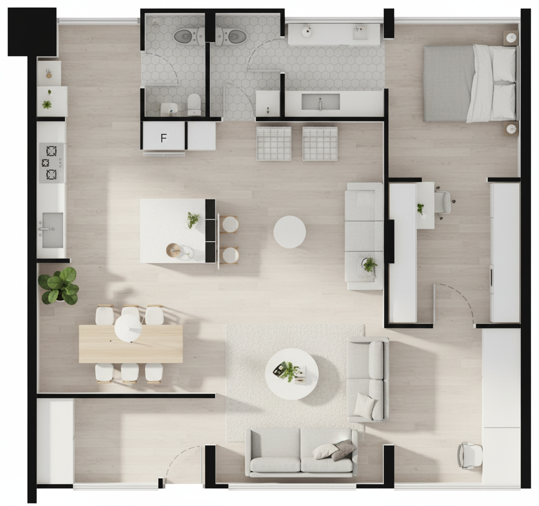 adopt the current layout plan fully and introduce a nice colored version to propose new finishes materials for a couple newlyweds to adopt scandinavian and clean look concept