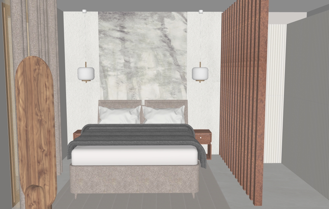 add led lights on the vertical panels behind the bed mantain sunlight led light just behind the vertcial pane behind the bed the wallpaper behind the bed shiuld be lighter almost white the bed is shorter in height