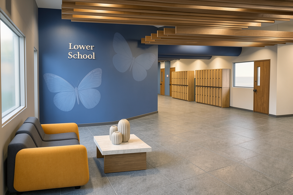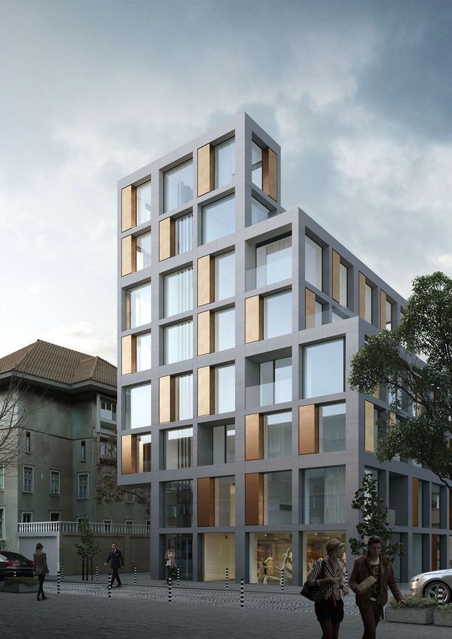 exterior shot do not change the image but make the white box a hotel building in the style of the reference image