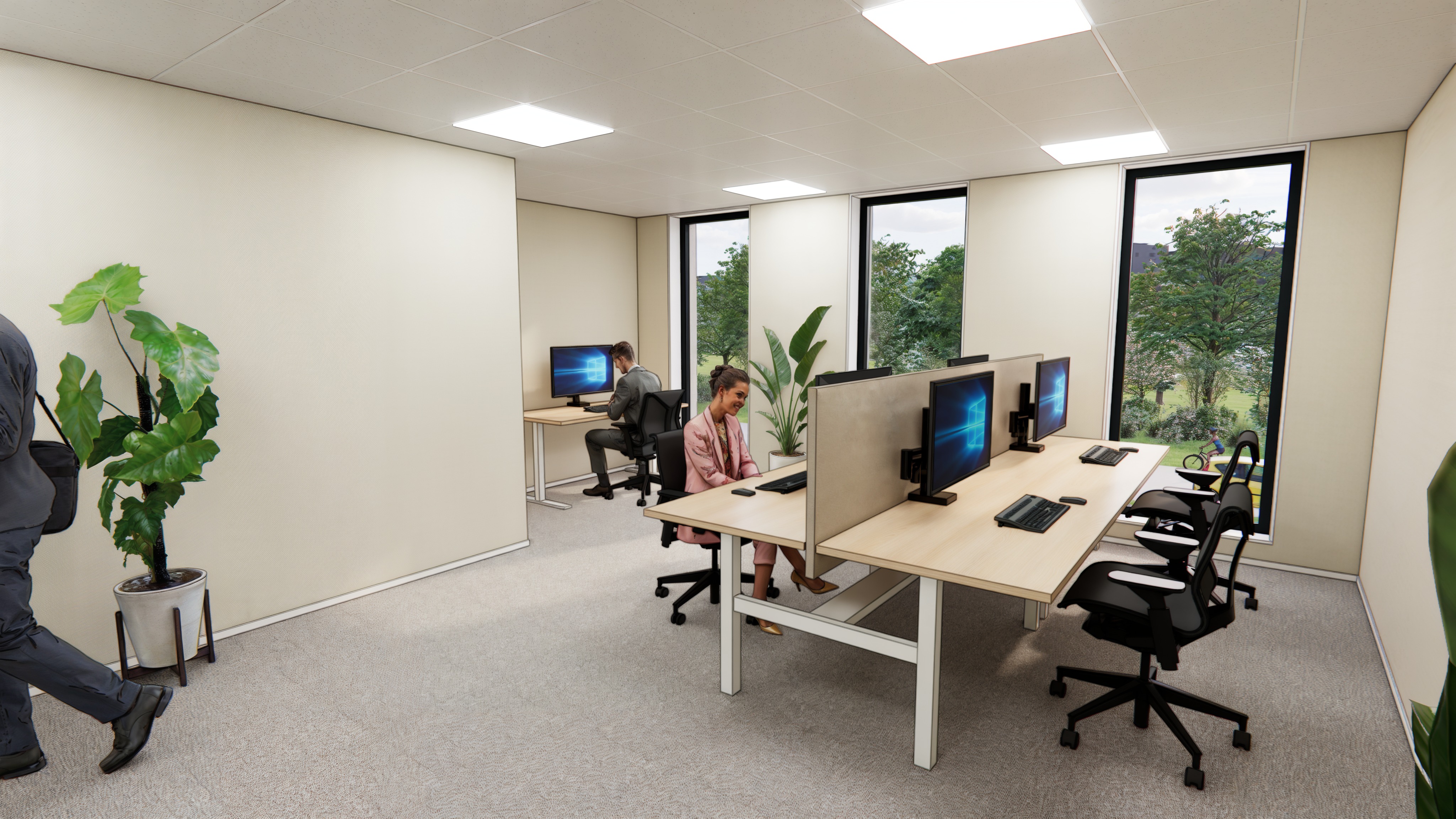 photorealistic interior office space open plan workspace light oak workstations with white steel frames acoustic desk dividers ergonomic black office chairs large floor to ceiling windows with view of green trees natural daylight flooding in from right side soft diffused light from recessed led ceiling panels light beige walls with subtle texture light grey carpet flooring with natural fiber texture large tropical indoor plants in white planters two professionals working at desks warm and calm atmosphere architectural photography shot on canon eos r5 35mm lens slight depth of field subtle film grain physically based rendering ultra sharp details 8k resolution award winning interior design photography