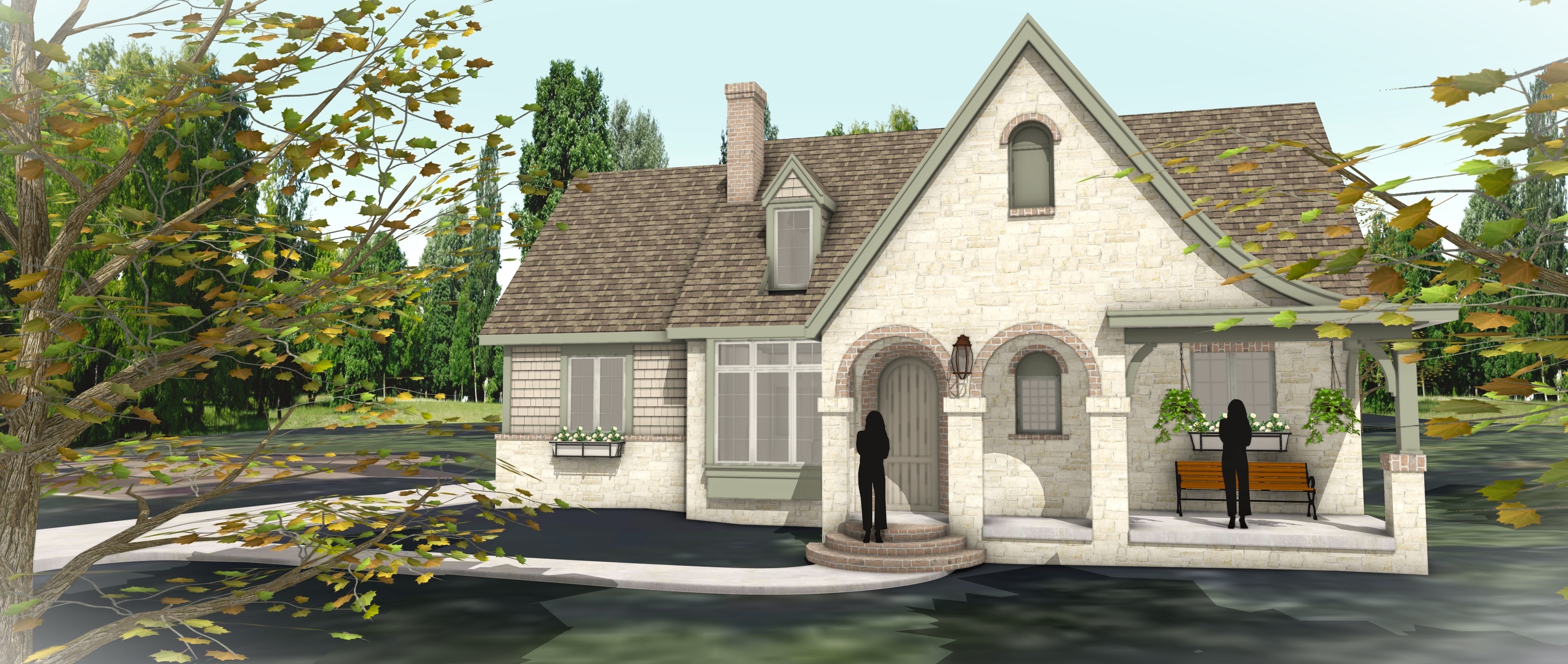 tudor revival exterior shot give a more photorealistic appearance to this render using a classic tudor revival style while maintaining the colors that are present architecture