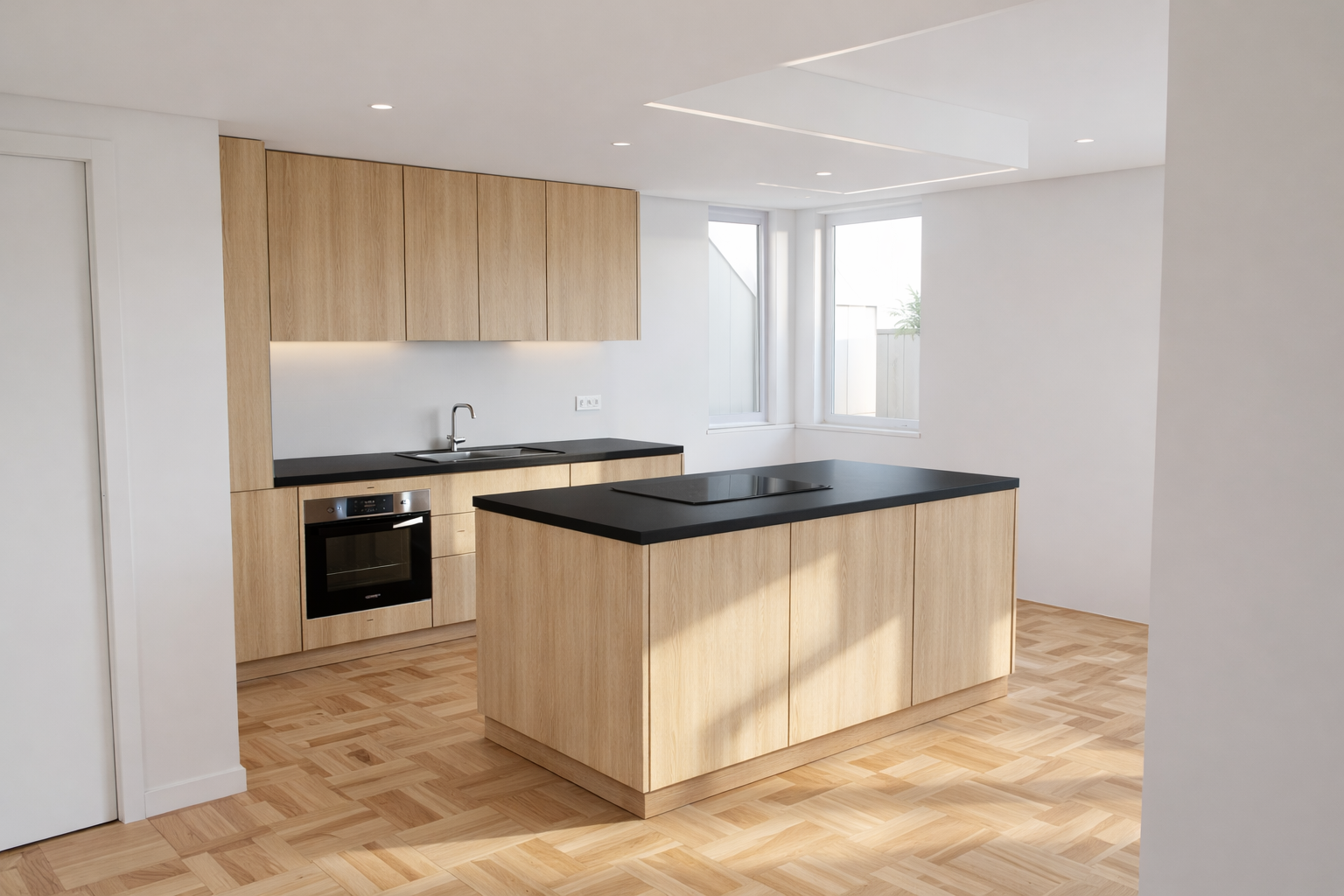 a modern kitchen interior featuring sleek wooden cabinets with a natural oak finish the countertops are a luxurious black granite the walls are painted in a crisp white complementing the soft gray flooring sunlight streams through the large windows casting gentle shadows and adding warmth to the atmosphere the ceiling is a sophisticated light gray the overall ambiance is clean contemporary and inviting emphasizing a minimalist design with a touch of elegance some cooking utensilt etc to give the picture a more lively feeling two hanging moodlights on top of kitchen island