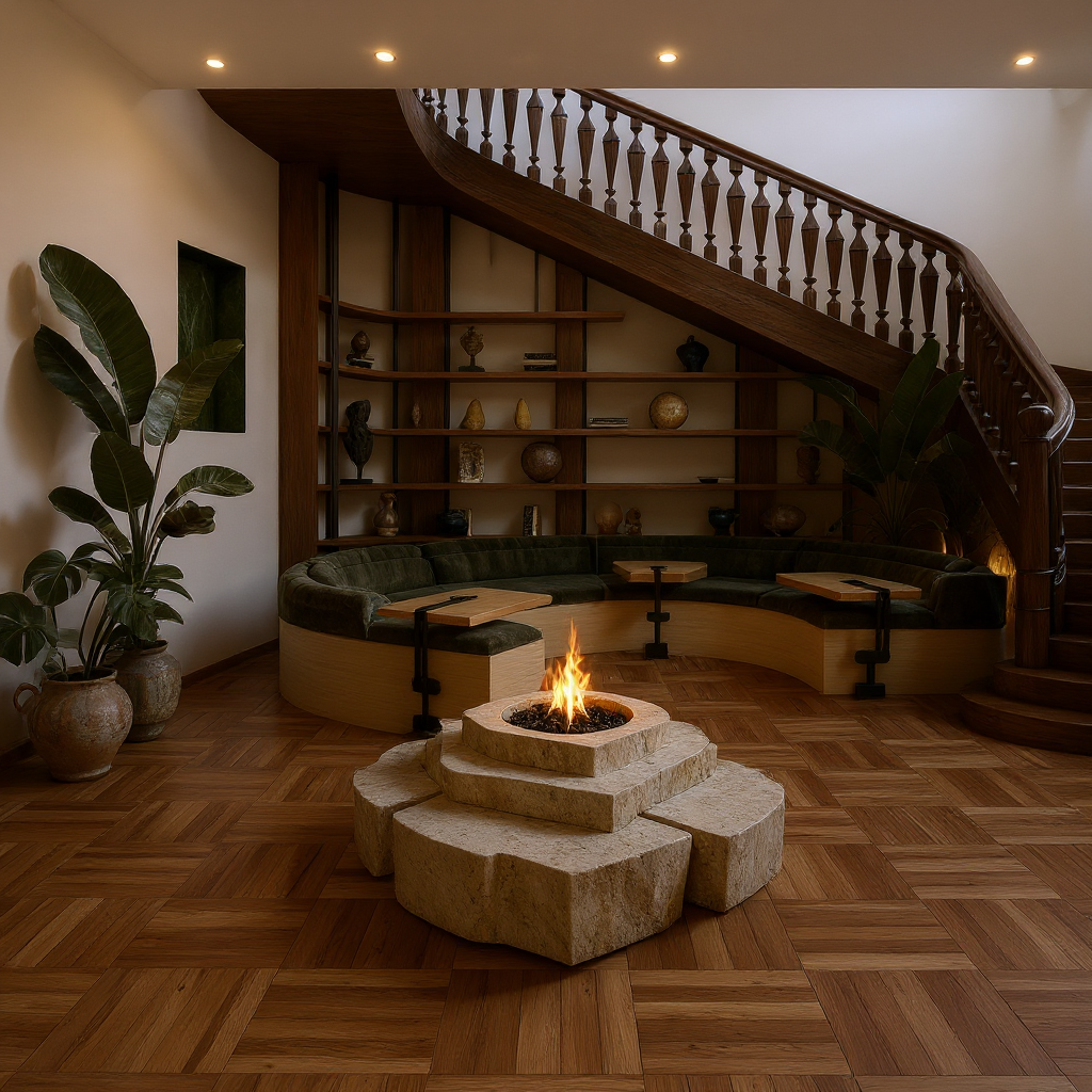 enhance the original living room render without changing any existing elements composition or furniture only adjust materials lighting and color tones to match the warm contemporary mood board apply soft natural morning light with gentle highlights and realistic shadows refine materials to have matte beige walls walnut toned wood surfaces and linen or wool textured fabrics keep the palette warm and neutral cream sand taupe and caramel hues enhance overall contrast softly for depth while maintaining natural color balance ensure all surfaces show tactile realism and a cozy elegant ambience consistent with the mood board keep reflections subtle lighting cinematic yet natural and atmosphere serene