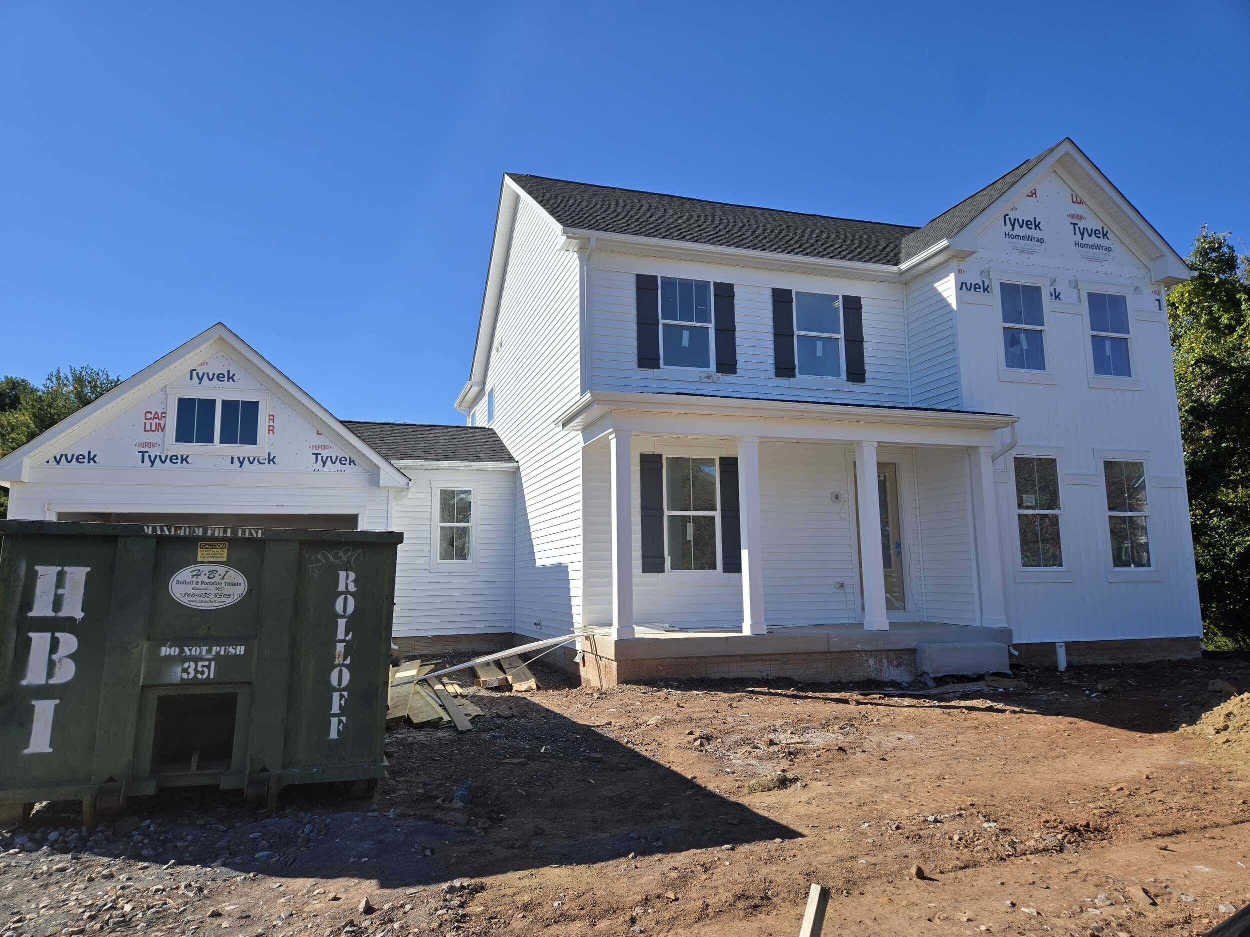 do not change anything on the house remove the roll off dumpster remove any debris finish the siding and add garage door in white i want to add grass and landscaping and trees