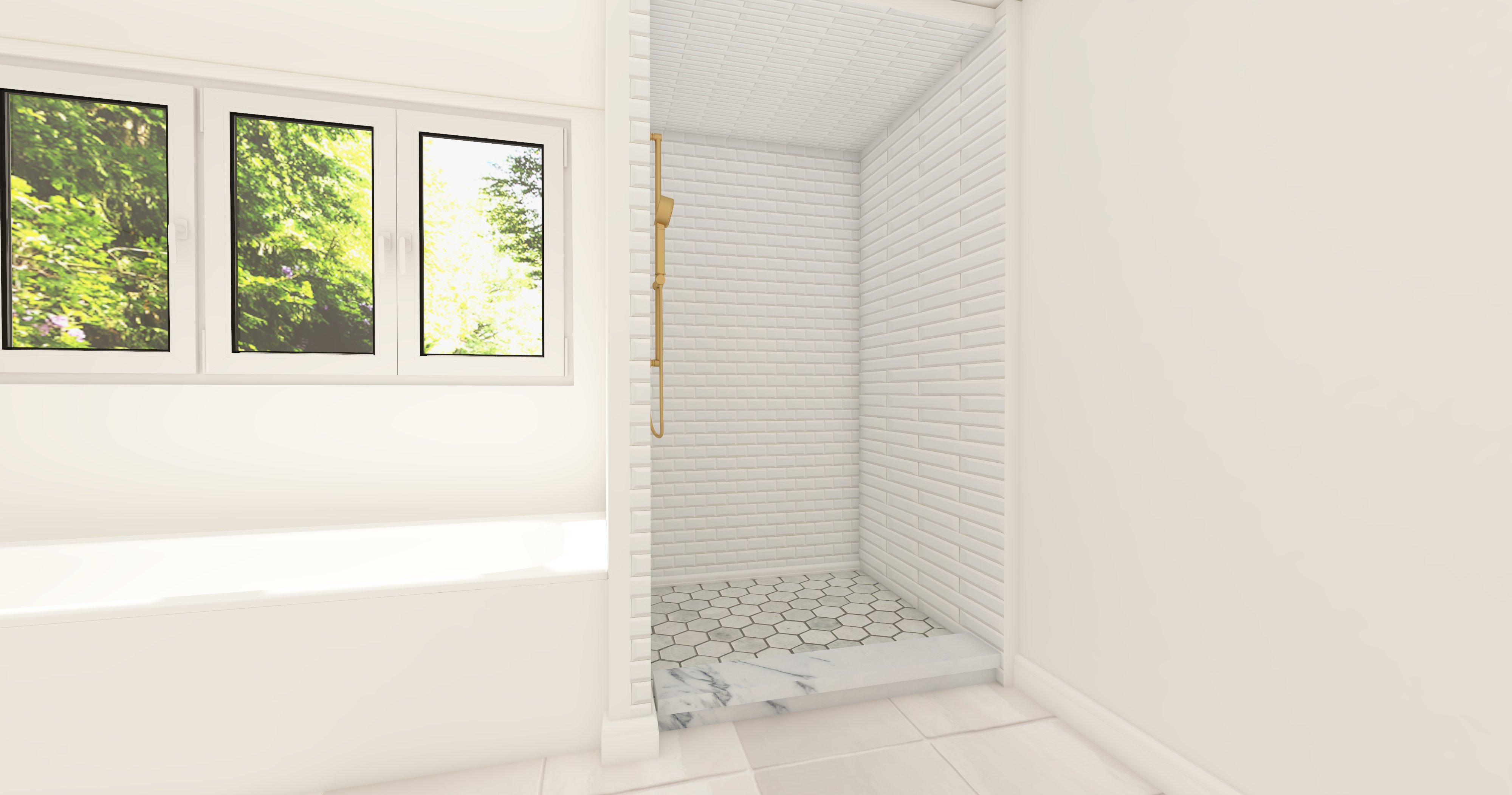 make the walls a soft purple put niche in the far right wall inside the shower make the shower walls a soft green subway tile and the shower floor a very small marble white hexagon add a glass door to the shower that s frameless and has a brushed gold handle add the green tile to the shower ceiling
