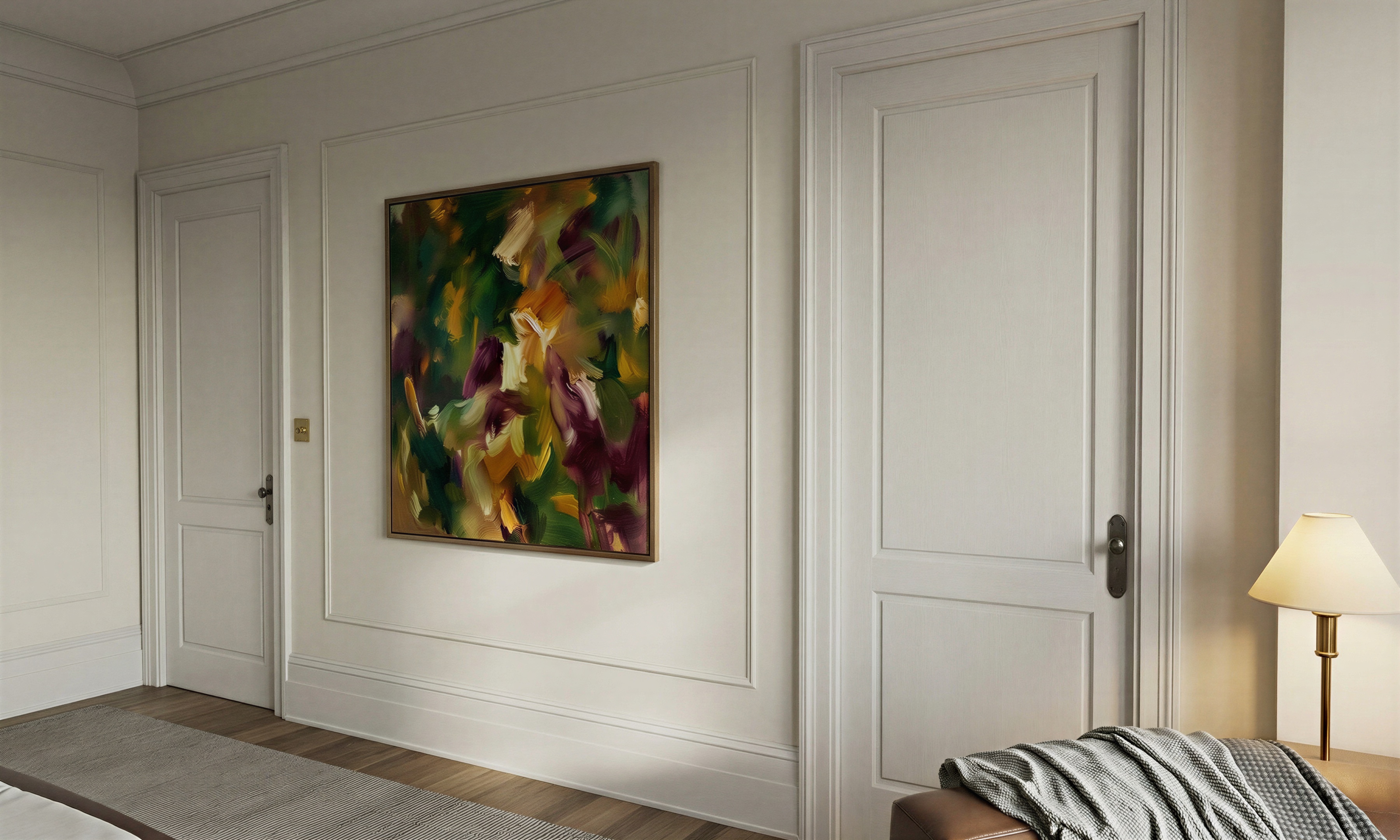 keep everything the same but change the painting and put something more neutral more classic and traditional chic less colorful