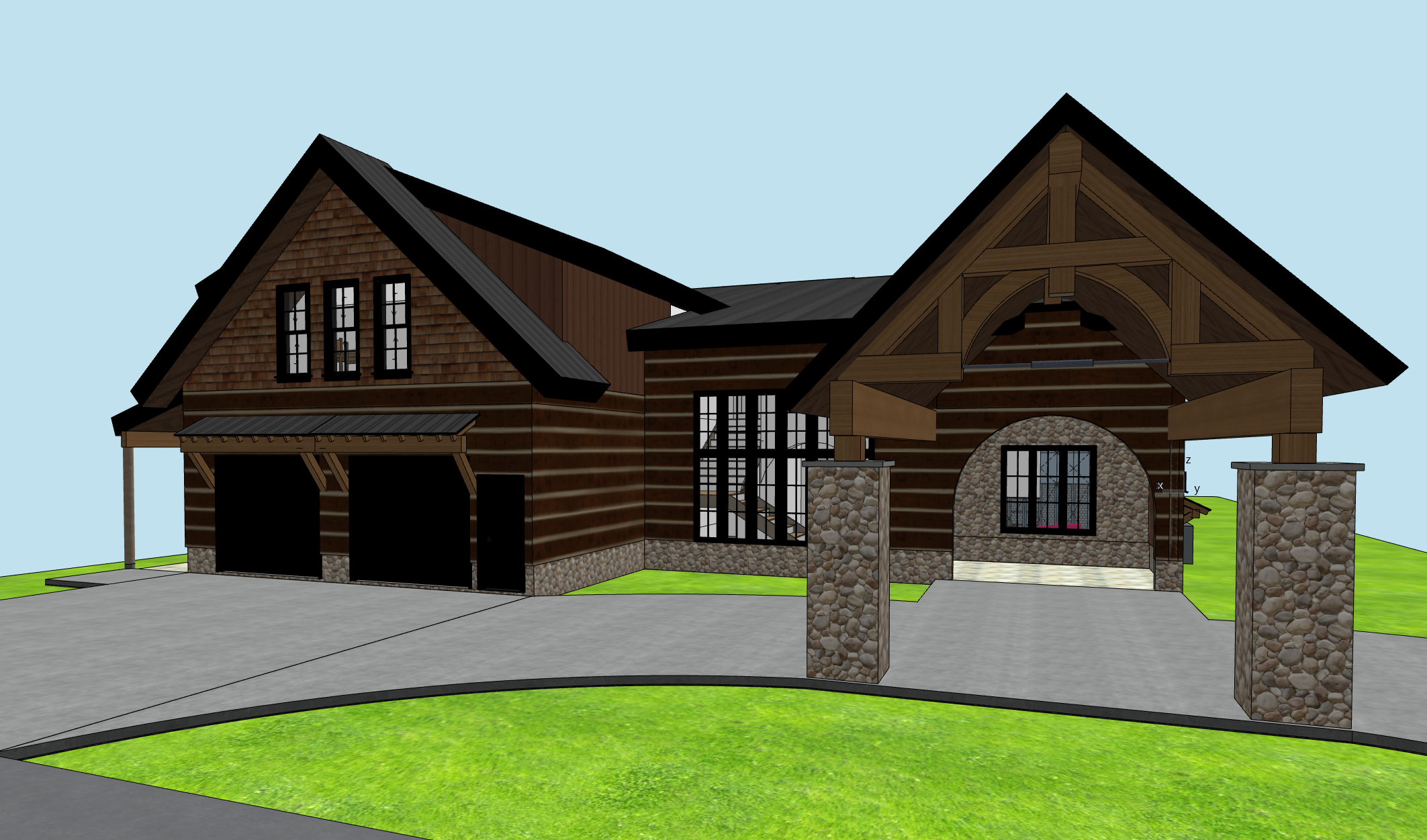 make this look realistic with pine trees on the sides and a river and forest in the background behind the house