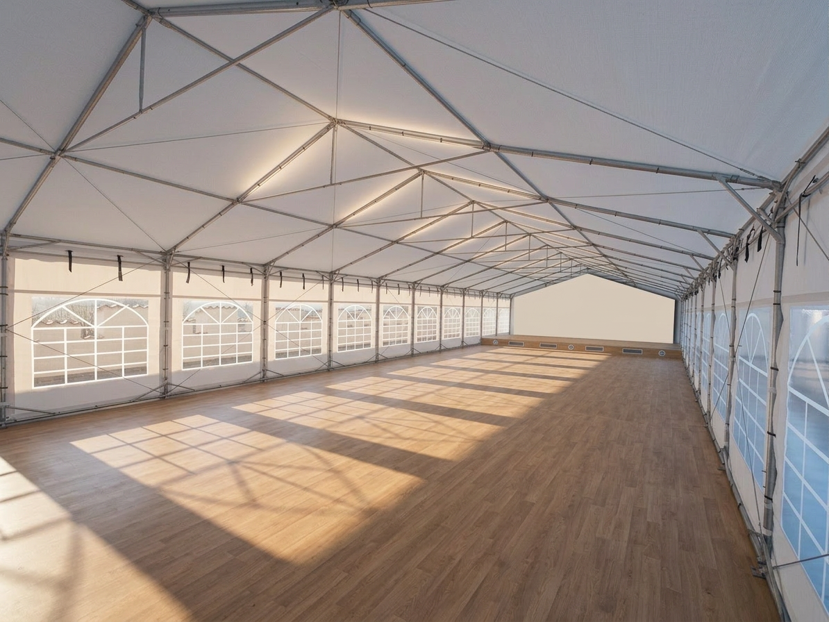 put in simple wide cylindrical chandeliers with white fabric shade into axis of room add weddinng small light chains add 70 percent transparent curtains on sides full length