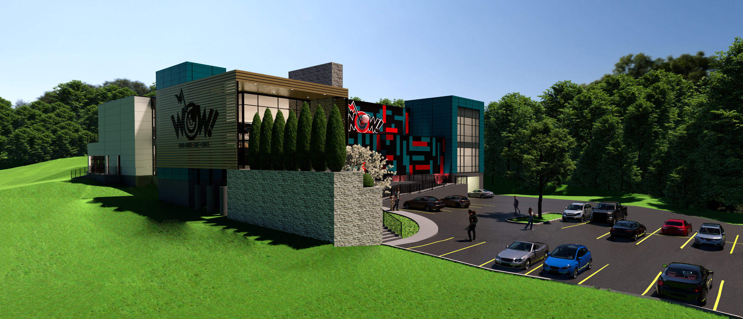 create photo realistic rendering of this building do not change any materials or colors just enhance them keep the view the same this is a vibrant entertainment venue