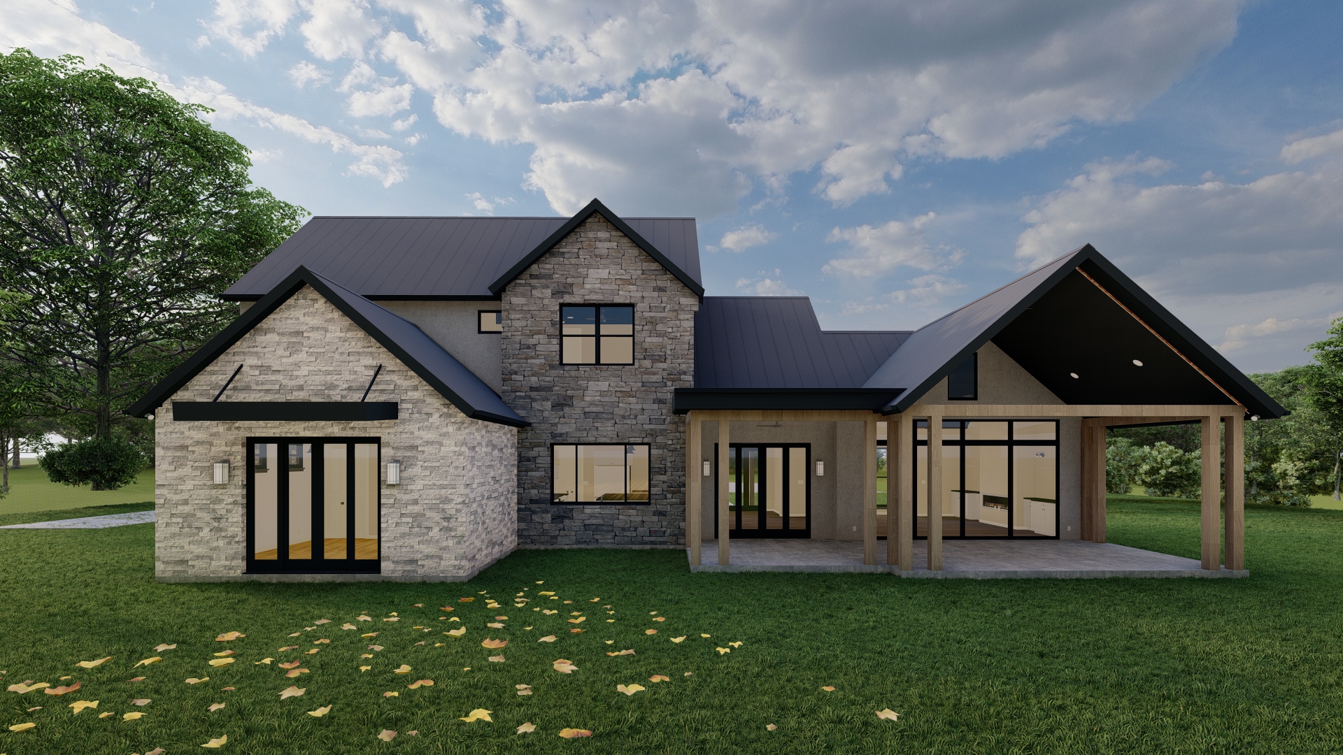 make this house more realistic and add a bright morning sky the house is well lit remove the logo in the left corner it is morning and bright