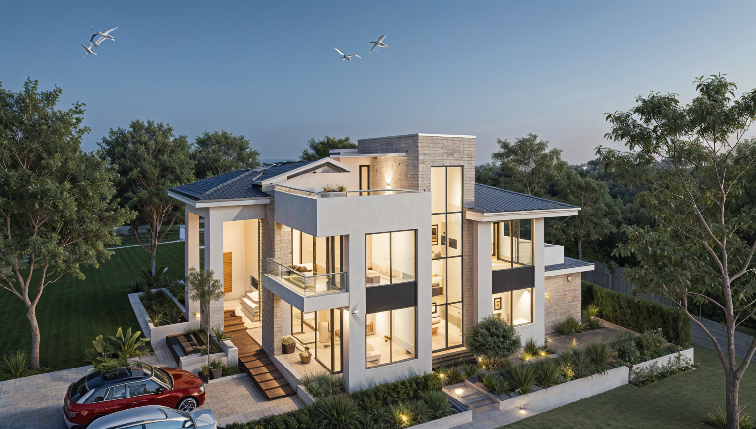 add some few trees and vegetation in to give context add creamish white interior warm lighting bluish sky maintain ramp please