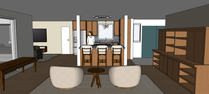 create a photo realistic image of this view from the seating area looking into the kitchen with a woman in the kitchen the cabinets are a natural oak with slab style front the countertop is a blue quartzite and the floor is walnut hardwood the wall color is a neutral soft off white shoji white from sherwin williams
