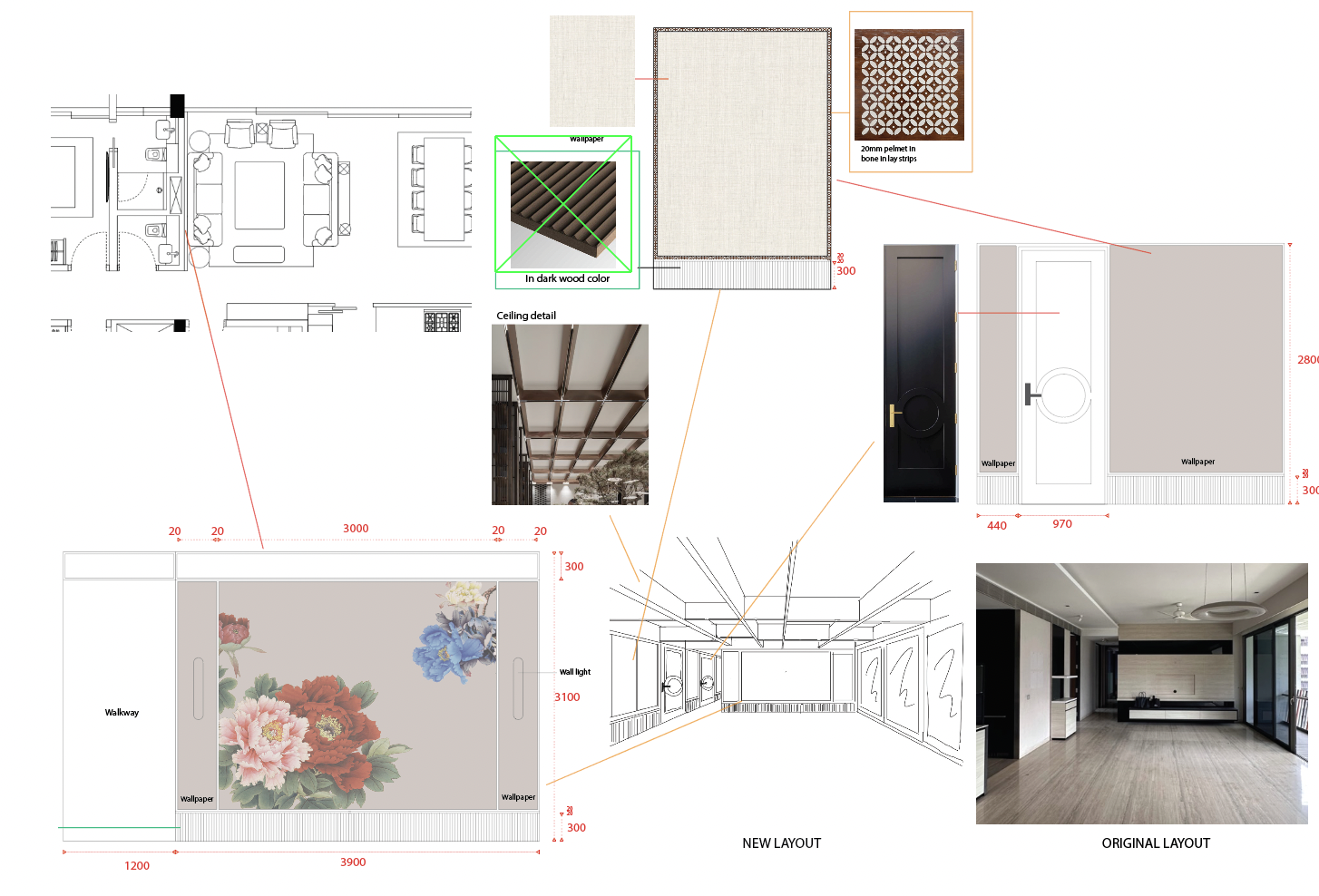 create a photorealistic 3d landscape render of a luxury modern living and dining room in a quiet luxury style with subtle contemporary chinese influence camera position standing in the living room slightly in front of the sofa zone at eye level 1 55m using a 24 26mm interior lens camera direction facing directly toward the feature wall with the watercolor peony mural what must be visible in this shot the full feature wall centered in the background part of the living seating area in the foreground one full side of dark framed sliding glass doors with curtains the opposite side showing decorative framed wall paneling the ceiling grid clearly visible spatial composition elongated luxury apartment living and dining space clear side walkway circulation strip opposite side is decorative paneled wall room should feel long elegant and tailored architectural detailing framed wall paneling with slim bone inlay trims fabric texture wallpaper inside the wall frames dark wood fluted skirting feature wall with centered watercolor peony mural muted gold leaf wallpaper on both sides of mural dark wood framing around feature wall composition contemporary dark wood grid ceiling with wallpaper lined insets furniture and styling low profile taupe or mushroom colored sofa sculptural modern armchairs elegant coffee table in dark wood stone and muted metal refined contemporary dining table with upholstered dining chairs luxurious rug with subtle texture material and mood dark wood antique brass bronze muted gold mixed metals woven wallpaper textures muted warm neutrals with restrained floral color accents moody sophisticated high end residential atmosphere editorial interior photography look important do not make the room boxy do not add extra windows do not create symmetrical hotel styling keep the room residential curated artistic and luxurious keep layout walls windows do not change the room layout do not add extra windows do not remove the feature wall do not make the room too wide or square do not over ornament the space do not turn this into a hotel lobby or restaurant