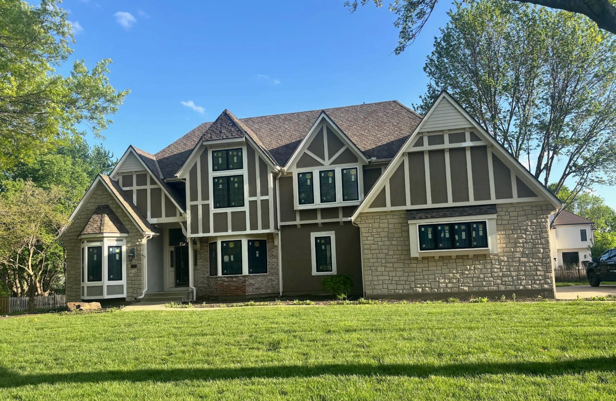 edit this house exterior keep the stone exactly the same change all trim including roofline trim fascia window trim and decorative battens to sherwin williams griffin dark charcoal gray change all remaining siding stucco areas to sherwin williams natural choice soft warm off white keep lighting shadows and realism consistent preserve textures and architectural details