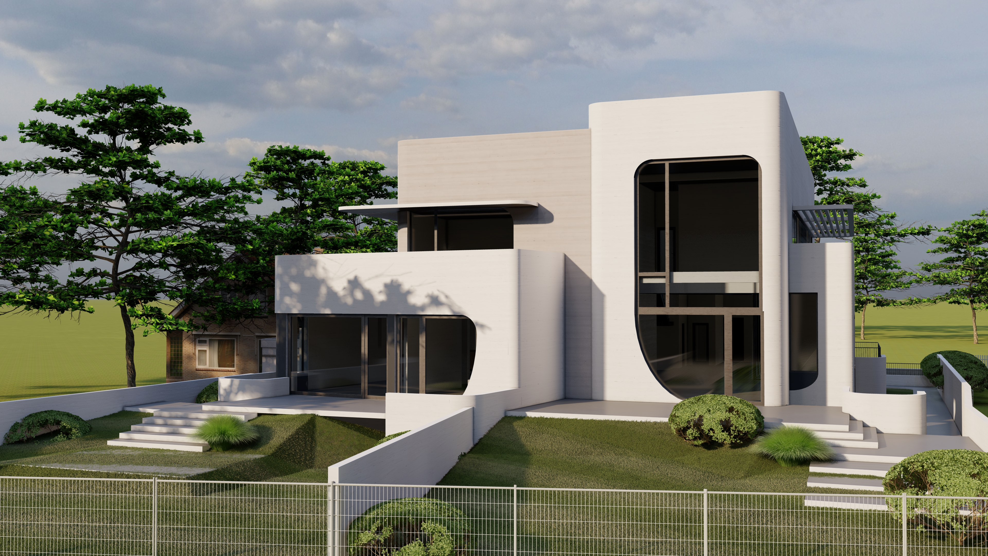 zaha hadid night shot dark colored sprout nice textures urban environmant beautyful sorounding vegetation daylight with beautyful redish yelowish clouds outside ambiantal illumination cinematic view architecture