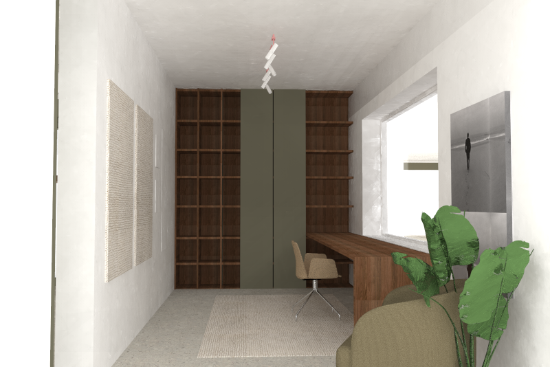 make a concrete ceiling pin some pictures on the pinboards on the right and put some books in the bookshelves