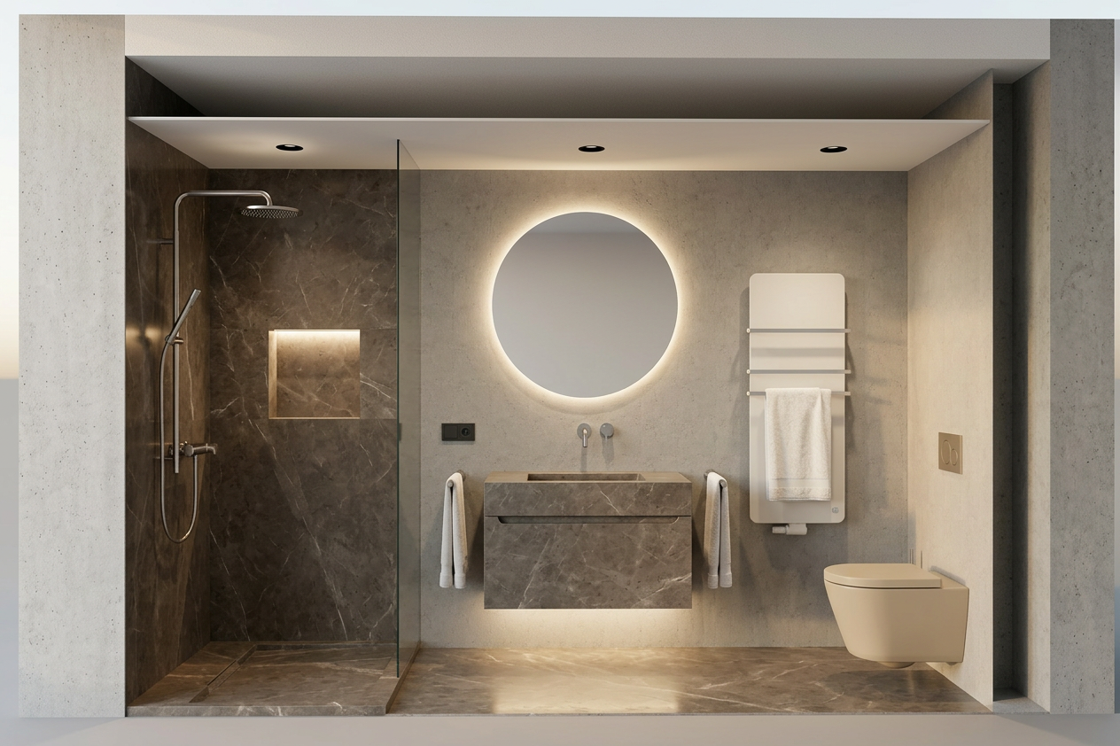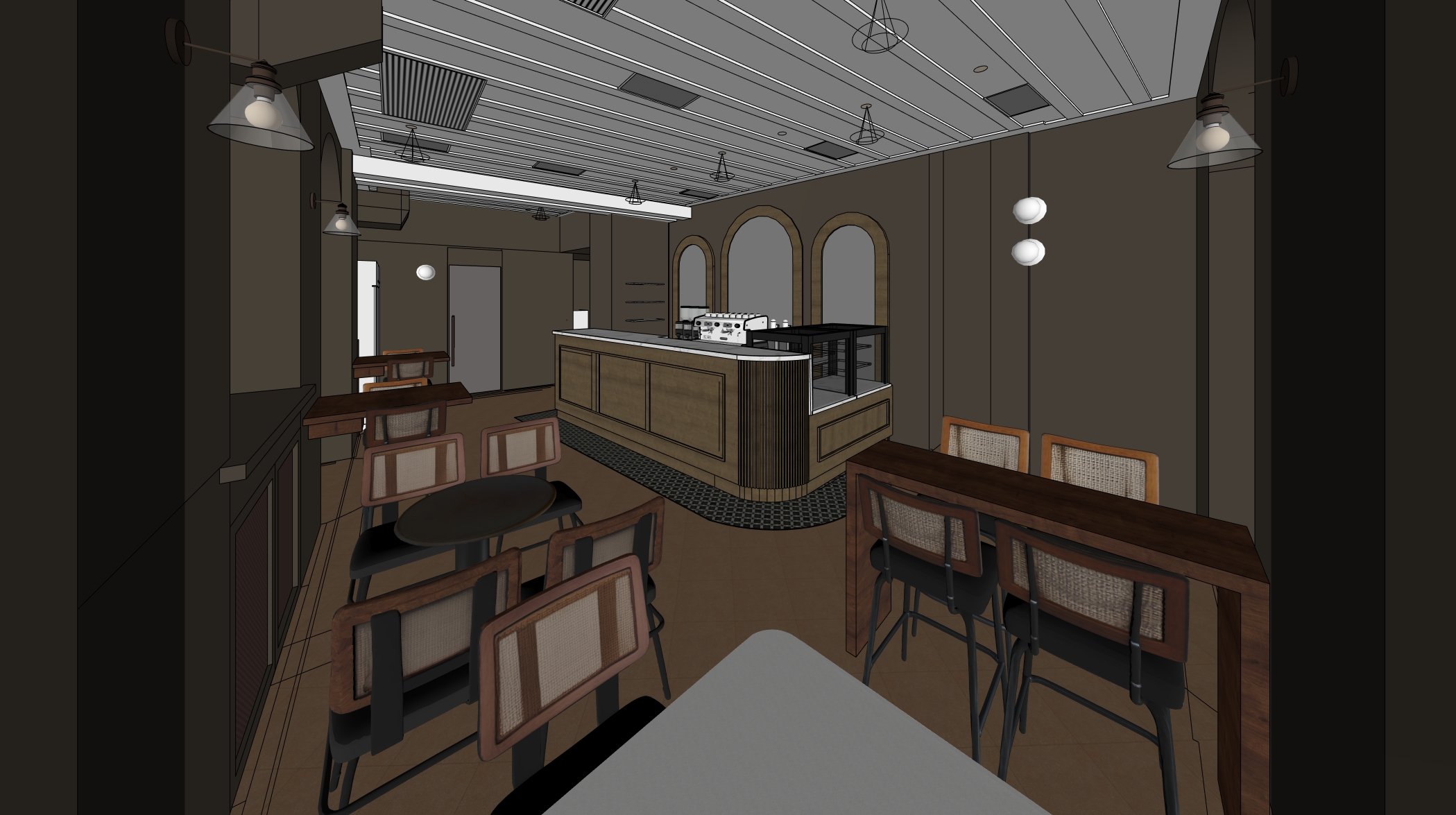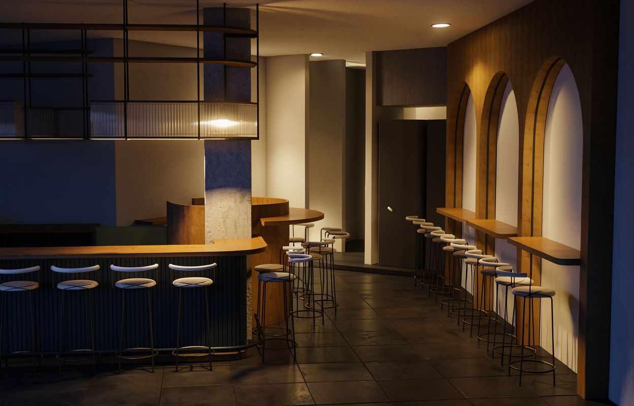 classical interior shot transform the provided coffe bar interior image into a high end photorealistic render with warm golden hour atmosphere soft glowing highlights and relaxed upscale coastal energy while keeping everything exactly the same same proportions same bar shape same booth seating same ceiling same wall finishes same curtains same materials and same spatial configuration do not move or alter any objects geometry textures colors or furniture positions the chairs throughout the restaurant must remain exactly in the same locations and proportions but their materials should read realistically chairs should appear upholstered in soft reddish black leather fabric with subtle natural tone but upholstere with a matte plush surface and gentle directional nap while keeping their black metallic shapes frames and positions unchanged add premium table settings including coffee glass and a cake on plate while keeping all tables and chairs in their exact positions include modern young guests standing at the bar and at selected tables casually social correctly scaled tastefully integrated without crowding or obstructing architectural details add two bartenders behind the bar preparing drinks and interacting naturally while preserving the bar s structure and alignment the display counter must clearly appear filled with cake and sweet with cool reflections moisture and texture while keeping its exact position and shape unchanged on the bar shelves add wine bottles and premium alcohol bottles arranged tastefully and evenly while keeping the shelving structure unchanged the shelving should feature warm and bright accent lighting enhancing reflections and bottle silhouettes the wall behind the bar shelves must clearly appear as amber glass in a deeper richer golden amber tone with a ribbed textured surface and illuminated from behind with warm vivid backlighting while maintaining its exact geometry proportions framing and alignment lighting should emphasize golden hour warmth gentle reflections soft shadows enhanced color richness and luxurious catalog level realism improve depth and realism through wood grain richness marble shine brass highlights fabric texture and polished clarity while keeping the entire scene exactly as originally designed architecture