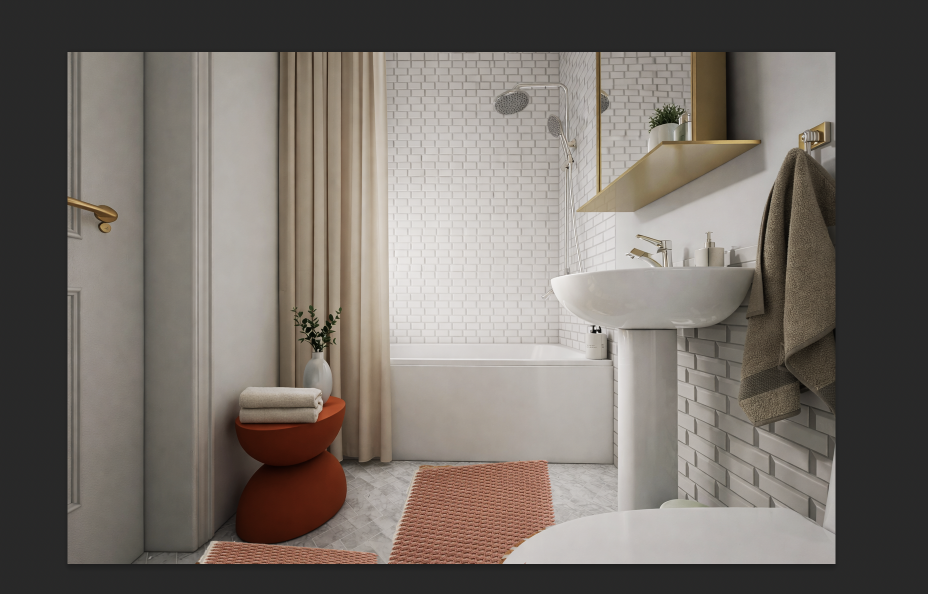 create a photorealistic rendering of a modern bathroom the walls are covered in sleek white subway tiles accentuating the clean and fresh atmosphere add a dark matte black shower fixture against the white tiles for a striking contrast the floor is tiled with light gray patterns that complement the neutral palette include a white porcelain pedestal sink next to a modern rounded mirror with a light wood frame above it a soft ivory towel hangs casually next to the sink on a black towel bar there is a white toilet positioned close to the sink maintaining the minimalist design on the floor place a warm brown woven mat to add a touch of coziness and texture a muted green waste bin sits discreetly beside the sink enhancing the subtle color scheme capture natural lighting streaming through the space creating a serene and inviting atmosphere