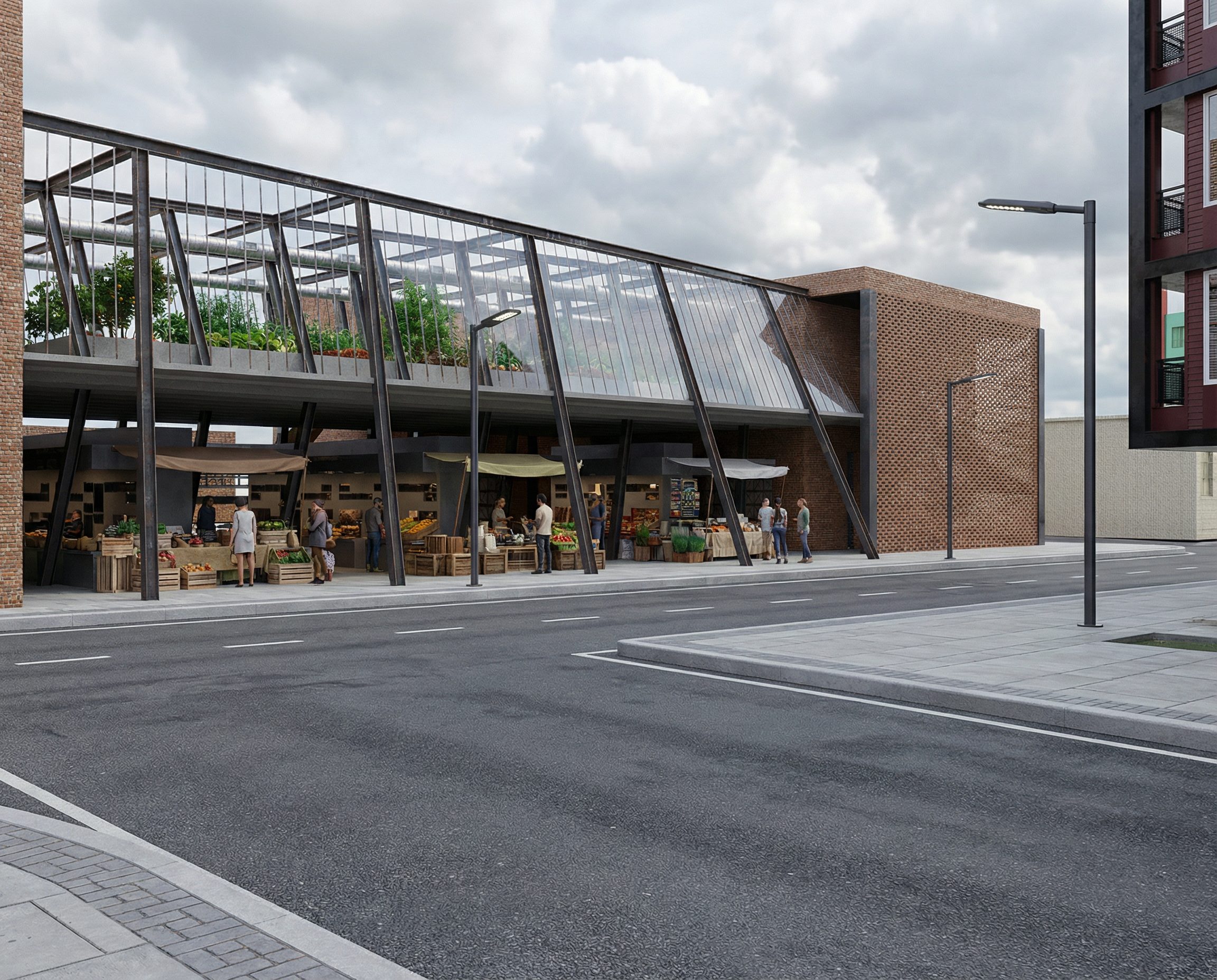 make street more streetlike and realistic with more modern ish lightposts no grass sidewalks and streets should be newer no people in the glass area on the second floor there is a greenhouse so put a bunch of crops just in the concrete planters there make the sky more realistic with more clouds basically northern virginia weather