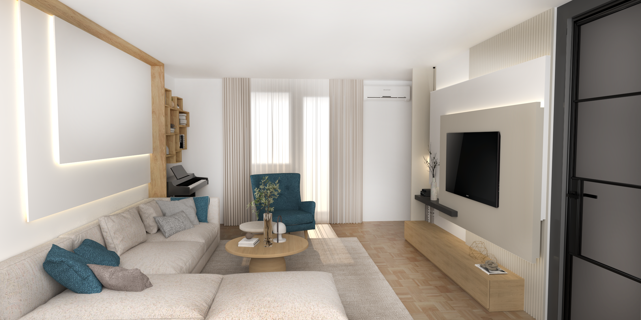 maintan original colors of materials do not add any new thing armchair blue plush no reflections on flat surface on the door with the black frame on the right side of the picture put a glass insert transparent darken and reflect