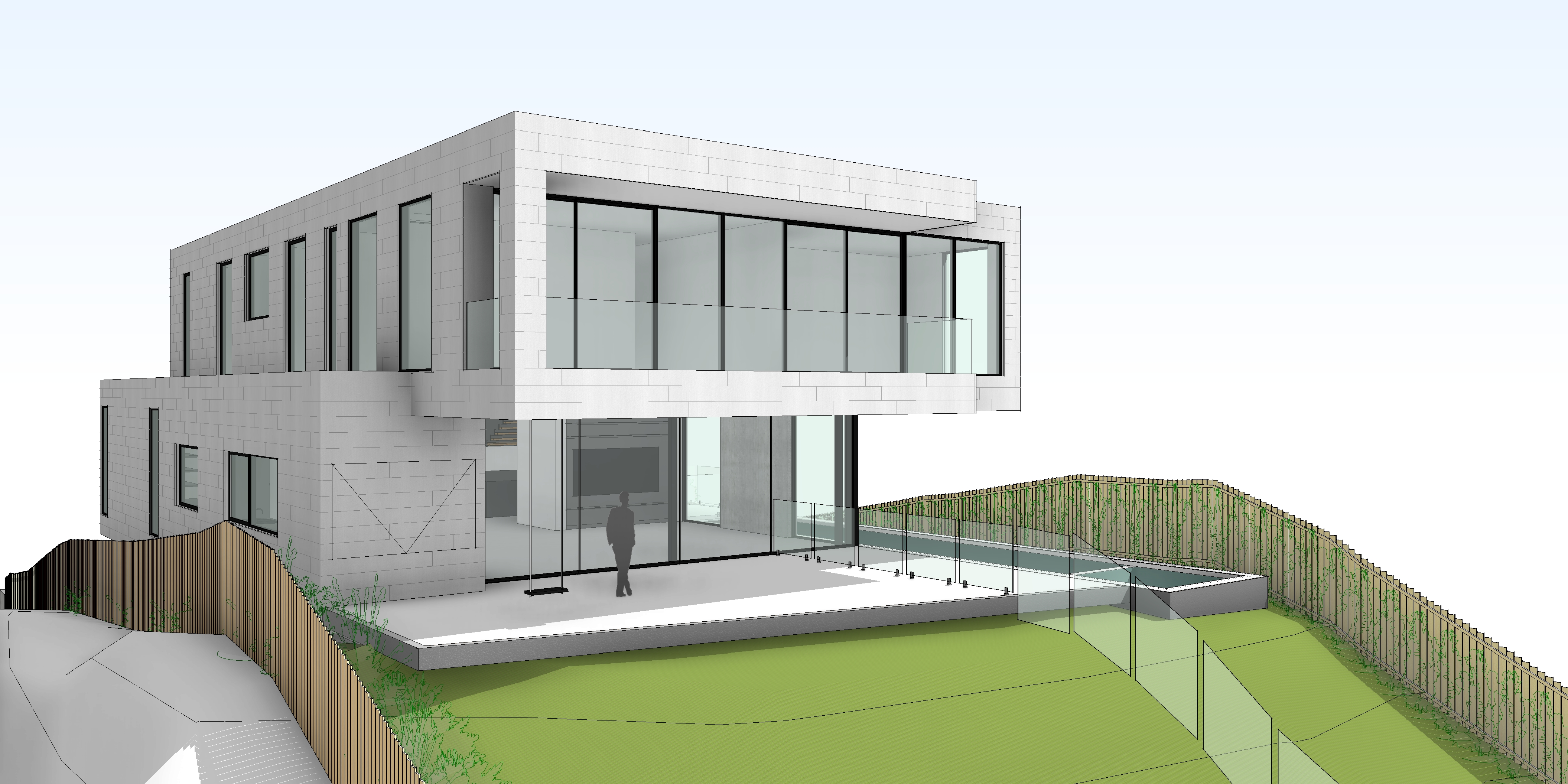 render a photorealistic 3d perspective of this house in wamberal nsw reference the current material style just enhance them brushed stainless steel flatlock metal wall cladding vertical board formed concrete walls keep model geometry exactly the same windows doors roof walls garage door pavement driveway make a lush vegetation that looks native to australia do not change the view only enhance the current materials and make the landscape nicer vegetation detailed textures in the cladding and glass reflections and a vibrant clear sky with light atmospheric depth render in hyper realistic architectural visualization quality 8k resolution