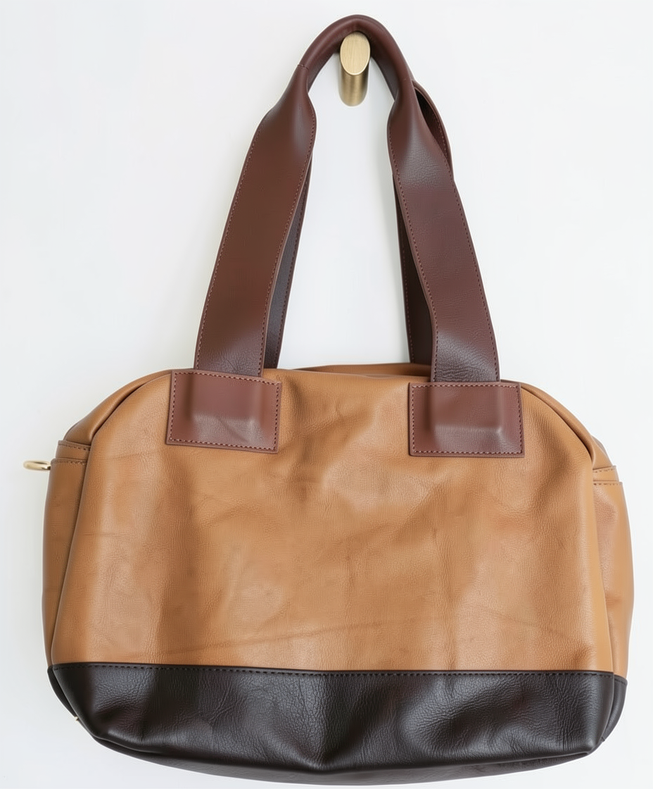 keep this exact same design with white background have the body be a grey sueded leather and then the straps and rectangle attachments to the handles be almond brown leather with the lower panel is black pebbled leather