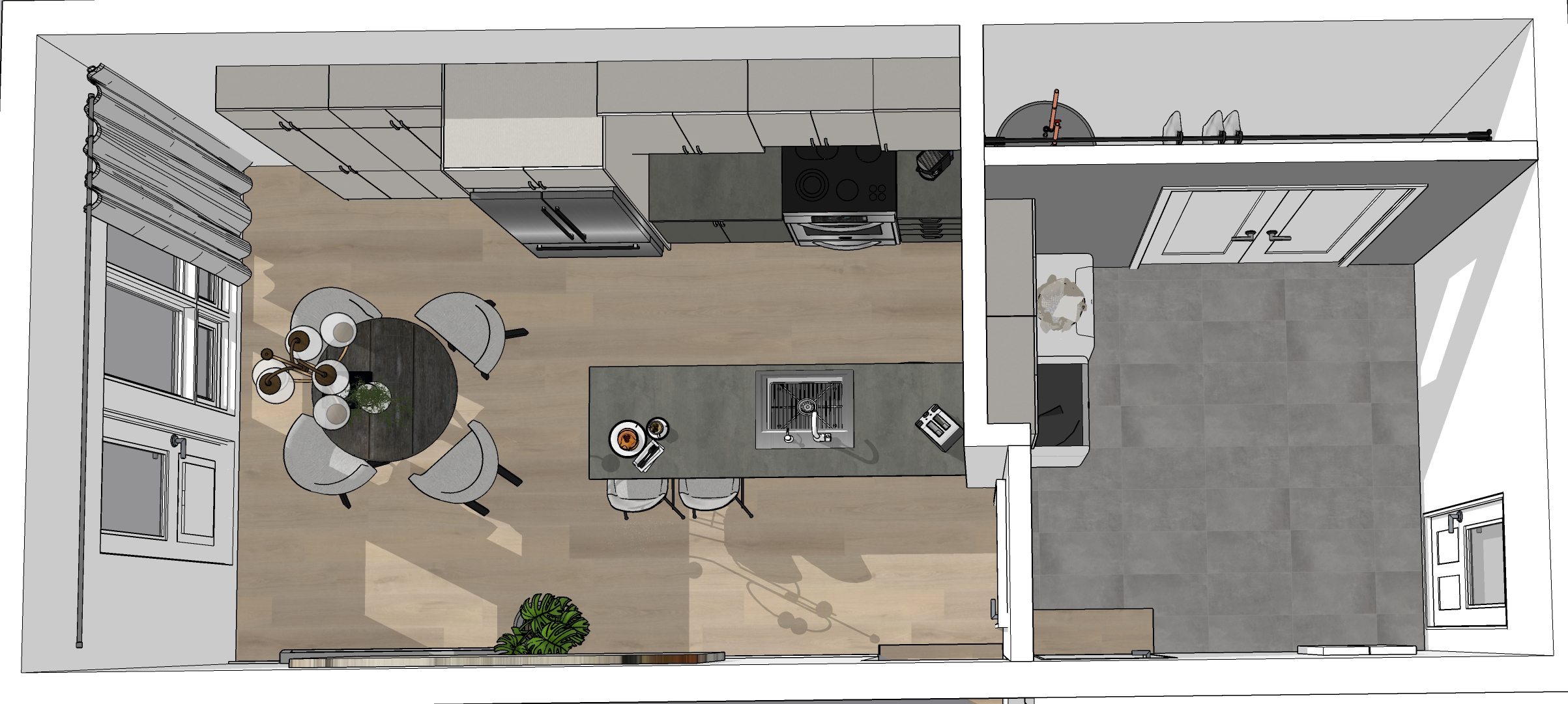 keep geometry create a beautifully rendered image of a modern kitchen use a neutral palette with soft white for the walls and cabinets the countertop should be a light stone texture the overall mood should be clean organized and calming