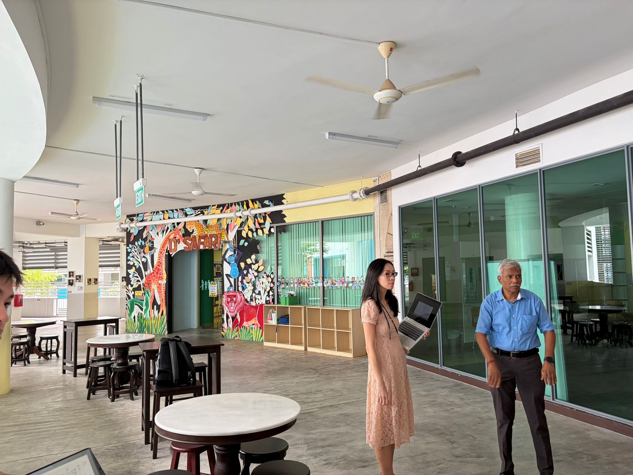 a spacious modern interior with a smooth light gray ceiling and white walls add a vibrant mural featuring giraffes and colorful foliage at the center with vivid oranges greens and reds the floor is polished concrete in soft gray include several round wooden tables with a dark brown finish creating a welcoming atmosphere large glass windows on the right side reflect teal and turquoise hues and ceiling fans and lights are sleek and understated the overall ambiance is lively yet relaxed with a blend of modern design and playful art