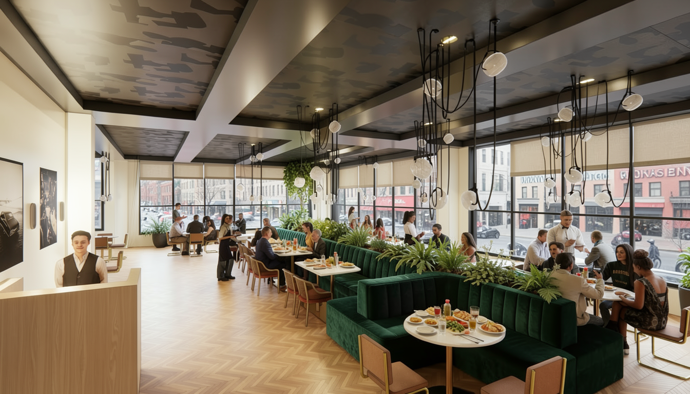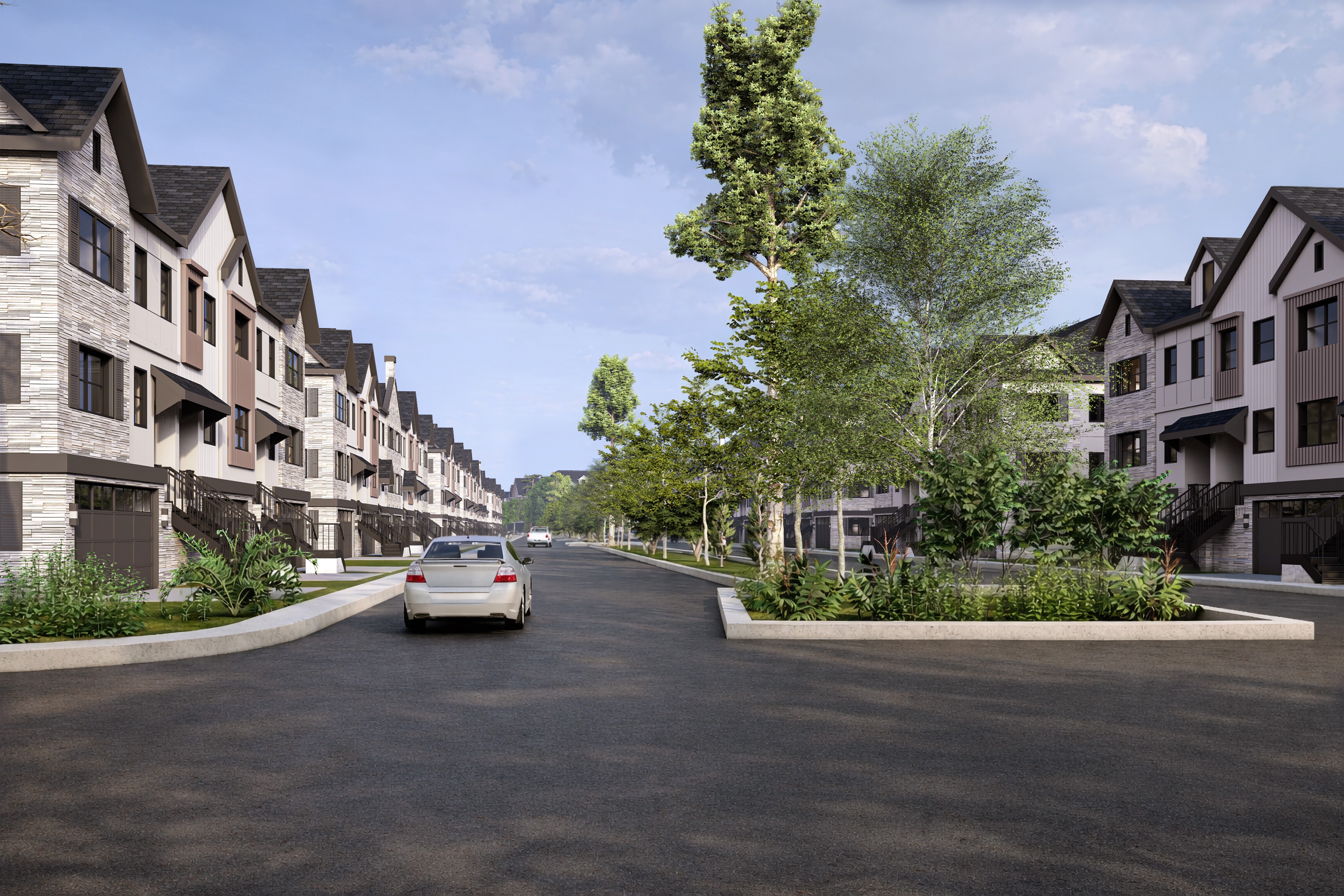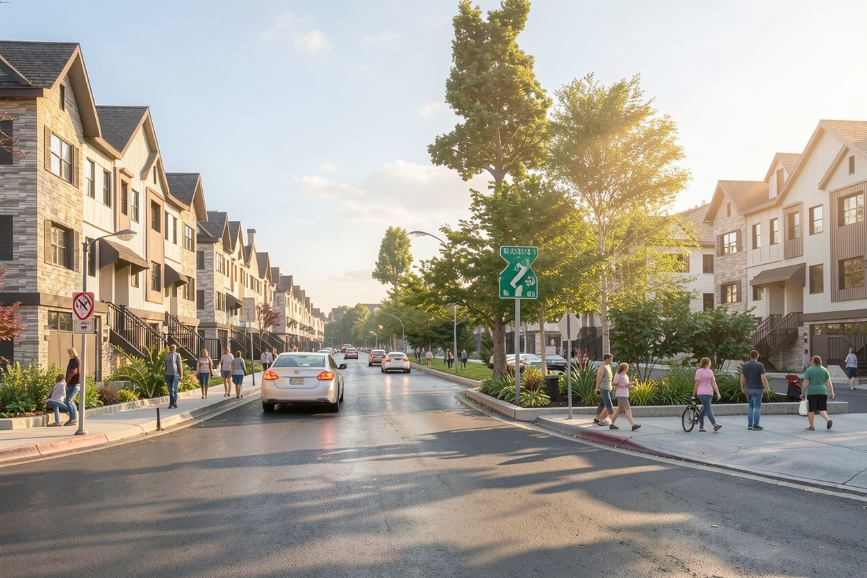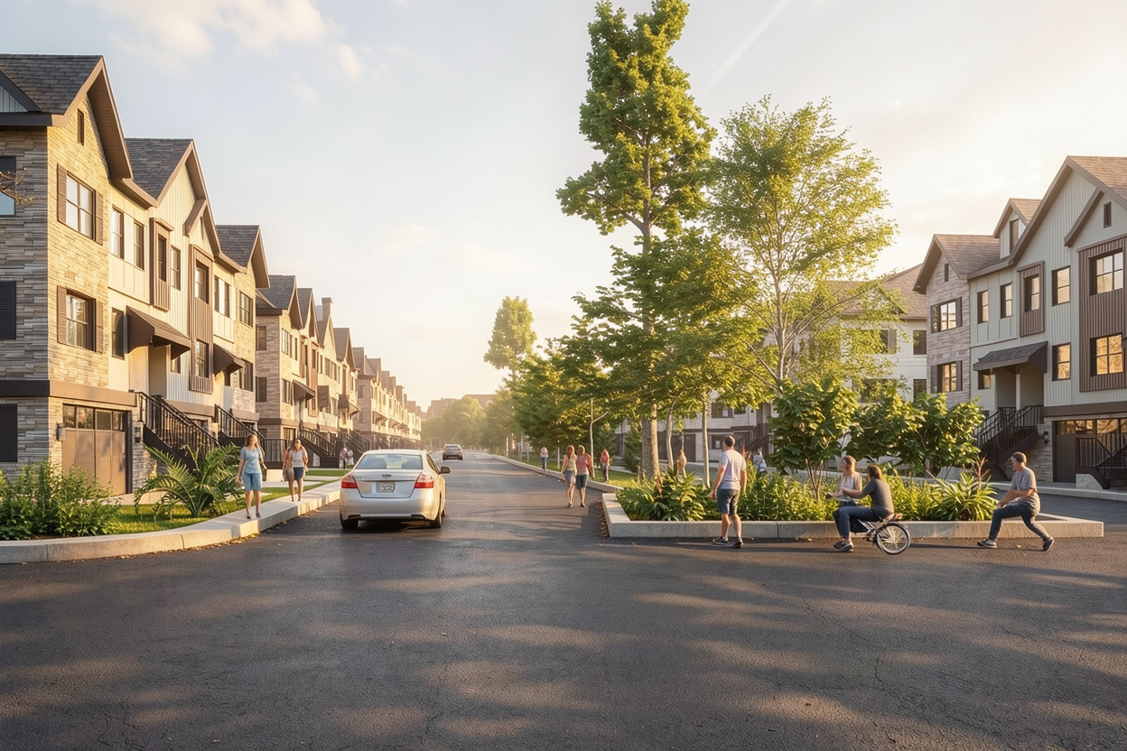 make it realistic for a new townhome redevelopment add few people for a peaceful environment