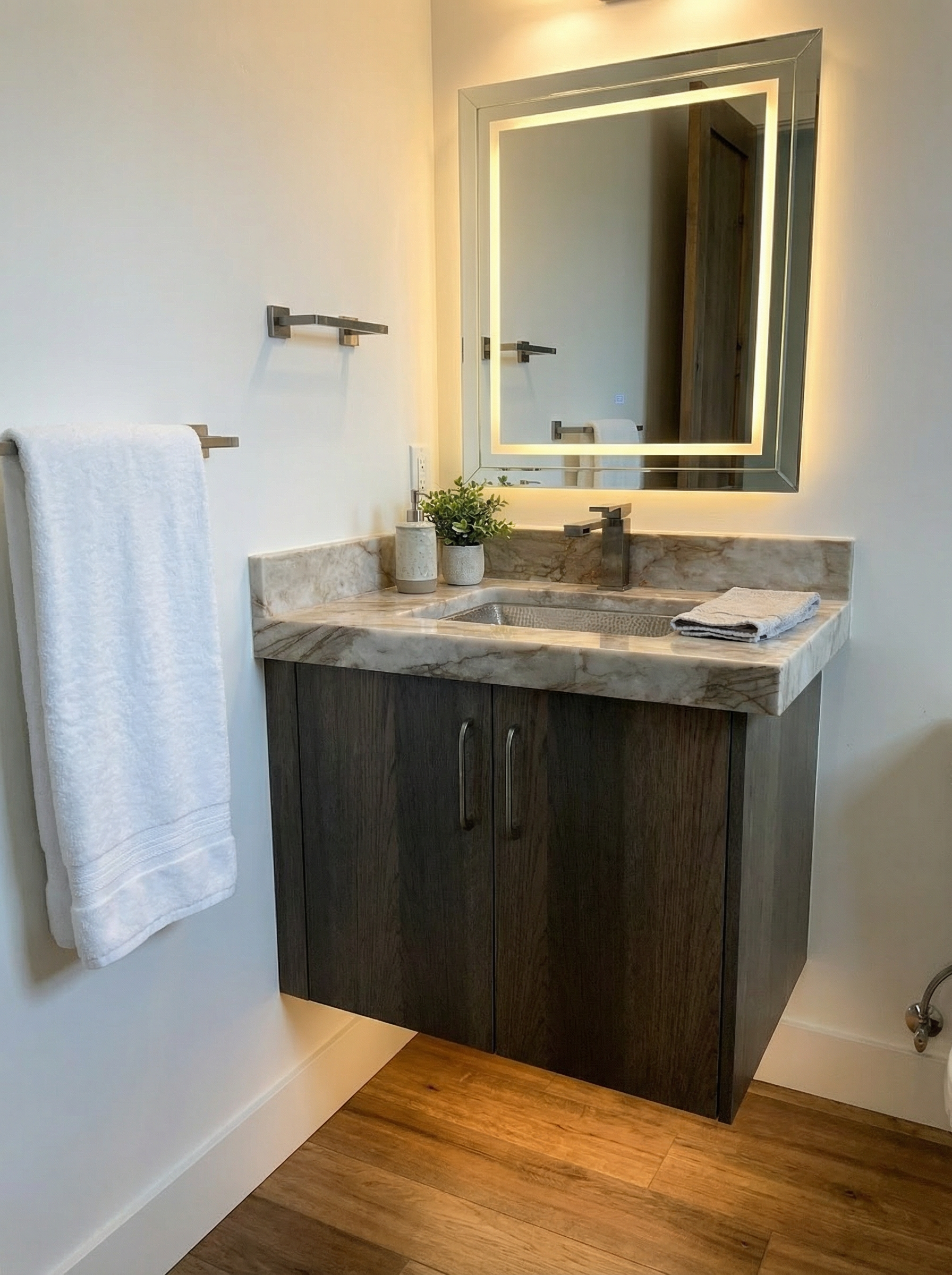 make photorealistic add warm recessed lighting wall and niches are drywall add trees and sky out window brighten