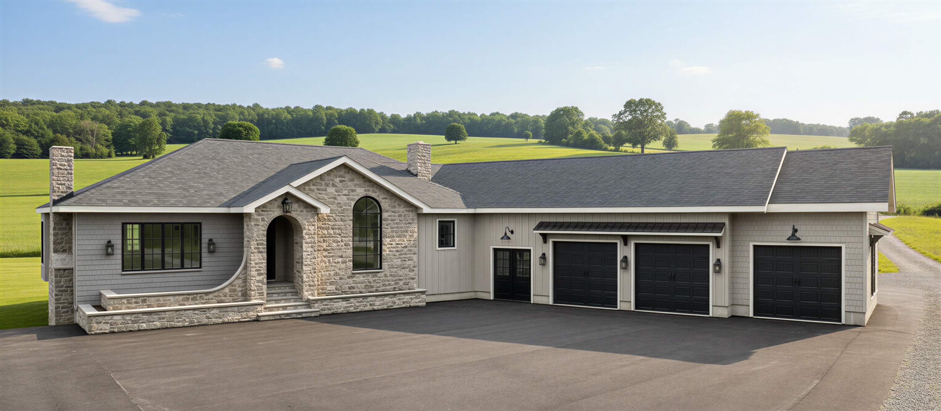 render a beautiful countryside house with a stone fa ade and griege siding with hedges in the front planters the roof is a darker shade of gray the garage doors are walnut contrasting with the neutral tones of the structure surround the house with lush green fields at golden hour soft warm sunlight bathes the scene creating a serene and inviting atmosphere