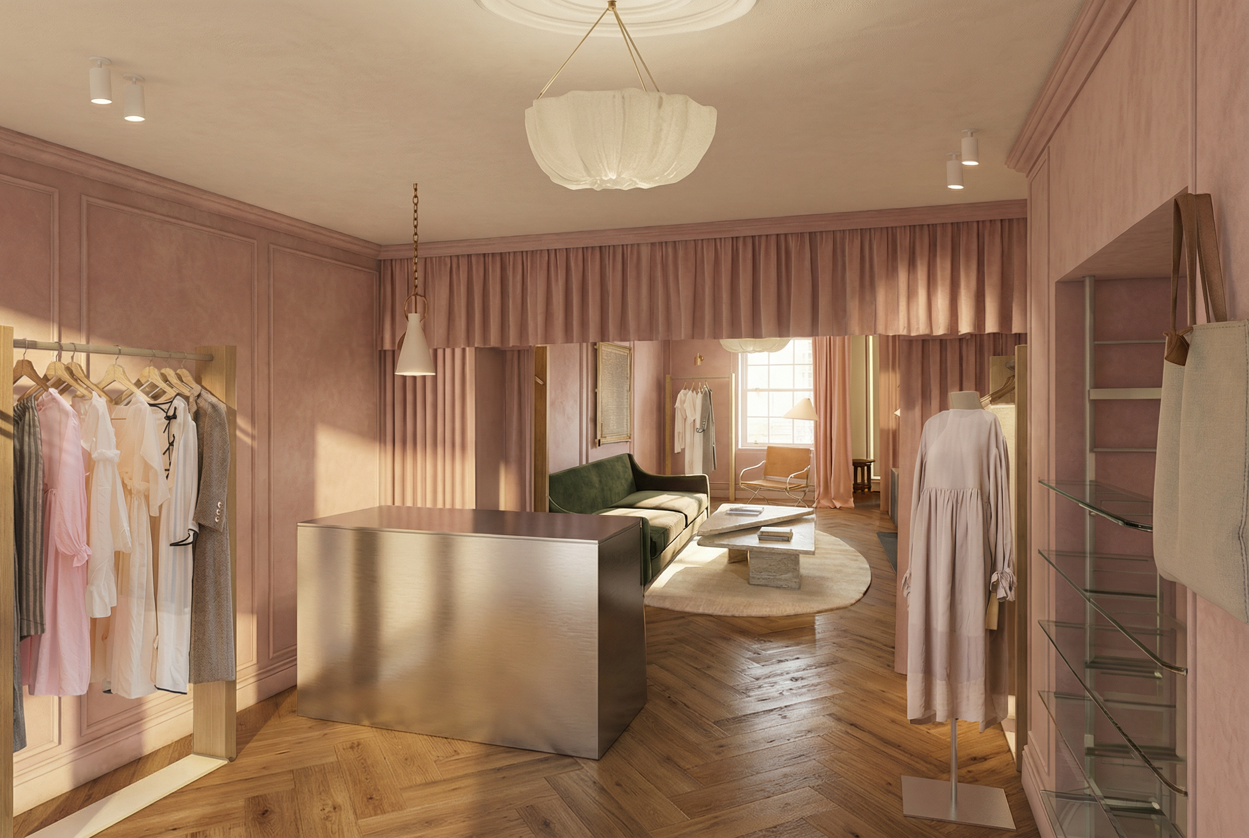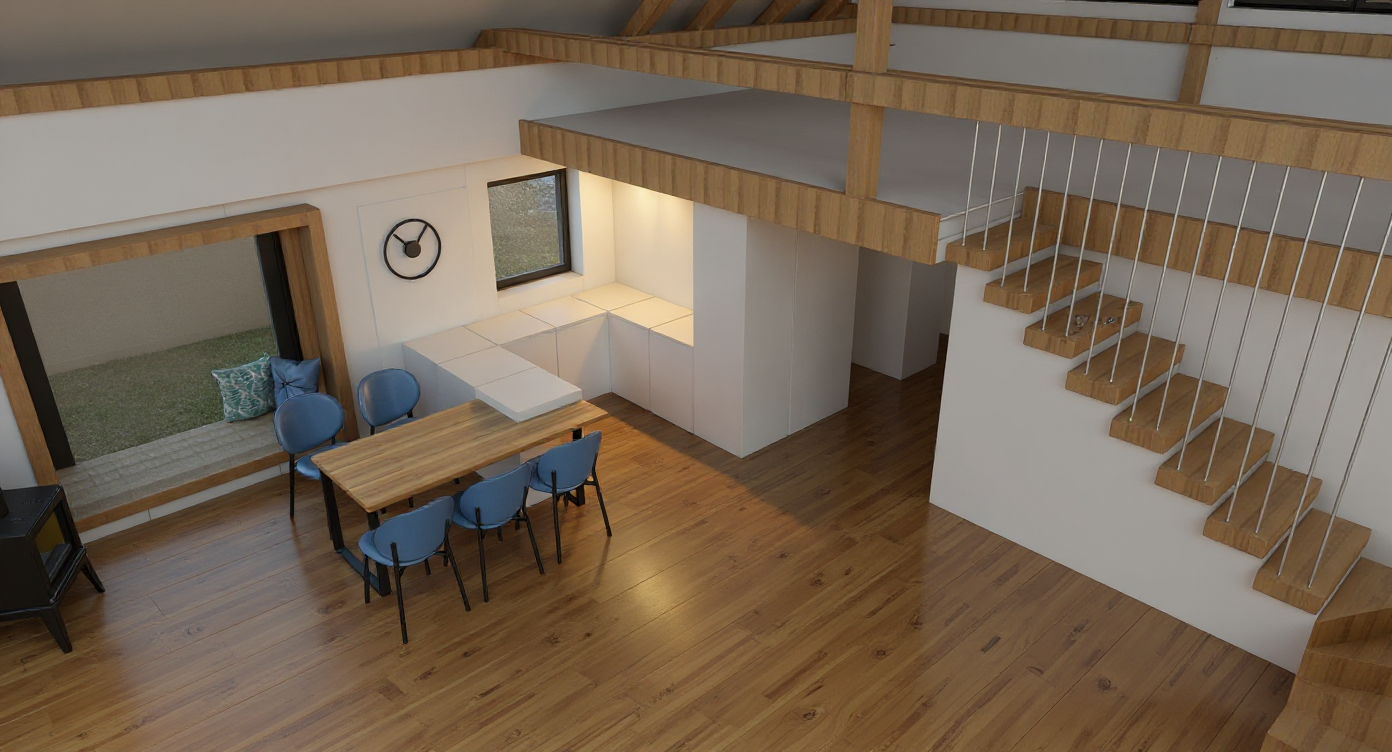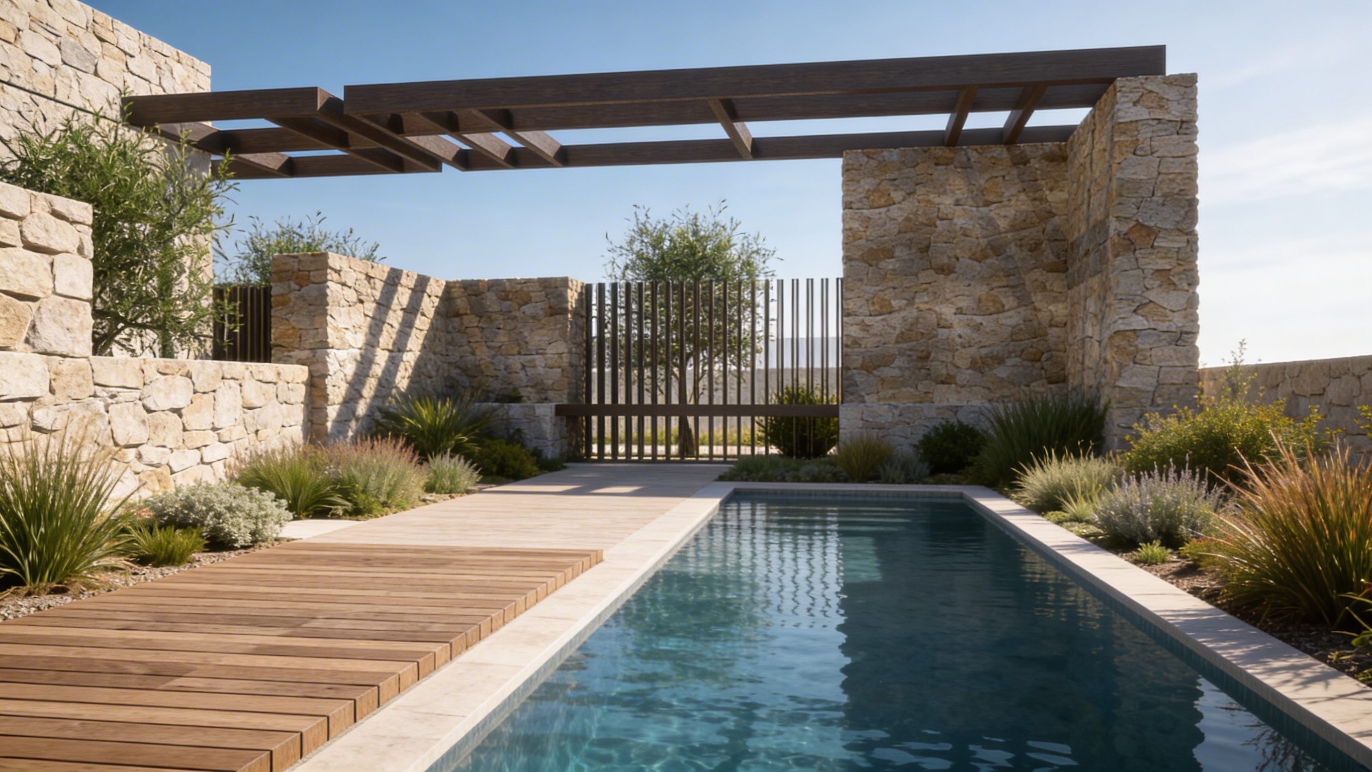 create a realistic high resollution materials image do not redesign the geometries or styles extra spots or linear leds create physical light inserts from outdoor midday daylight red marble tops on tables switch on lights give boutique hotel atmosphere it is a breakfast area add decorative items on tables add at the background on kitchenboard extra items and food for breakfast the material on the floor is a rock effect stone greige color chairs are dark green pal color outdoor all the walls are with natural stone brick keep the geometry of chairs as they are and do not change it metal frame and seat