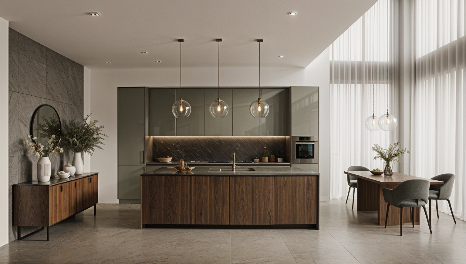 render a beautiful two story organic modern design house with a welcoming atmosphere the exterior features a soft white facade with light color brick and wood accents the front door is a warm natural wood blending effortlessly with the home s elegant yet rustic aesthetic the windows are large and plentiful framed with a matte black finish enhancing the modern appeal set against a clear blue sky the house is surrounded by lush greenery with colorful flower beds of lavender and daisies lining the walkway the atmosphere is tranquil and inviting capturing the essence of modern country living