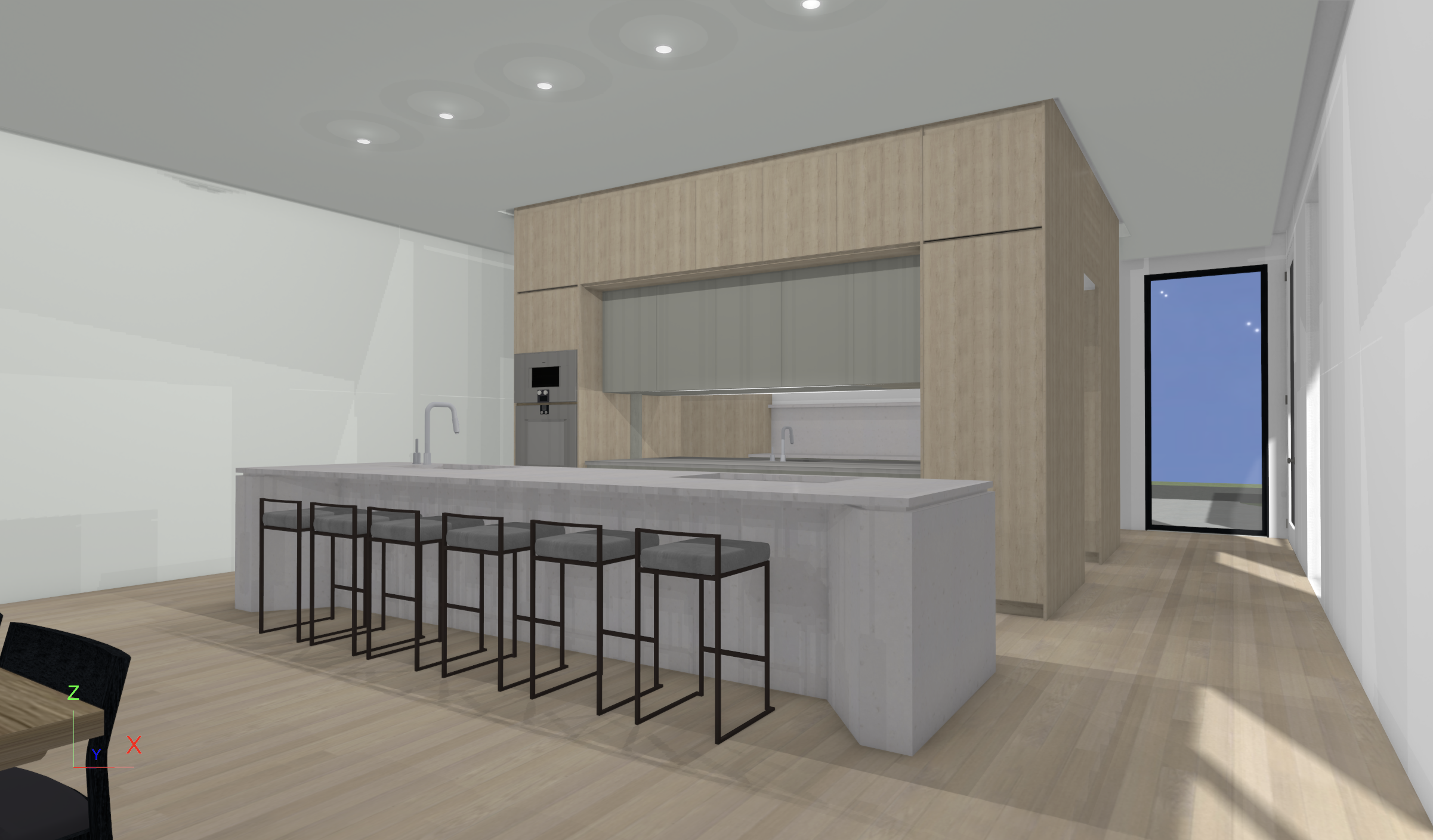 add modern art on the wall some basic flowers on the island show a woman with flowing dress at the cooktop cooking dont change any of the design elements