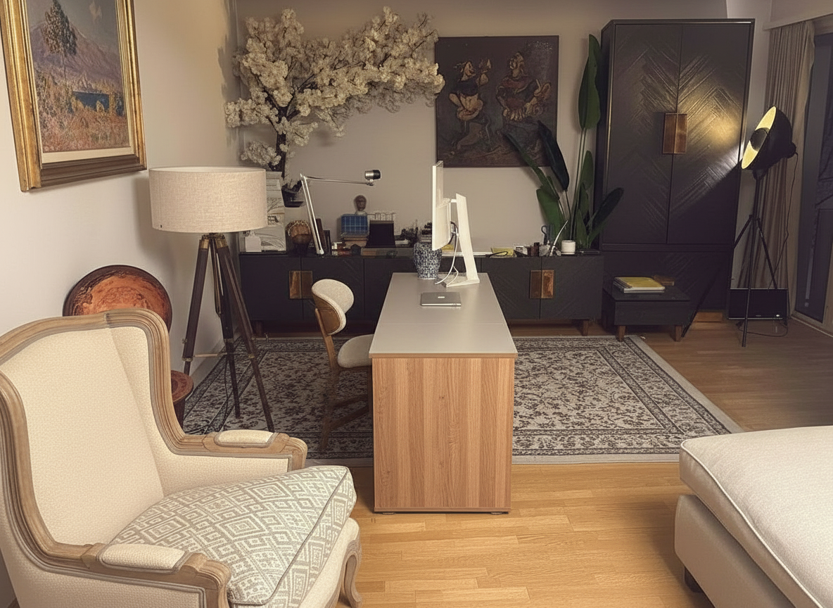 modern and minimalist living area with elegant furnishings flush fitting door white walls and herringbone parquet flooring flat white false ceiling with spotlights soft ambient and artificial lighting that creates a relaxing atmosphere