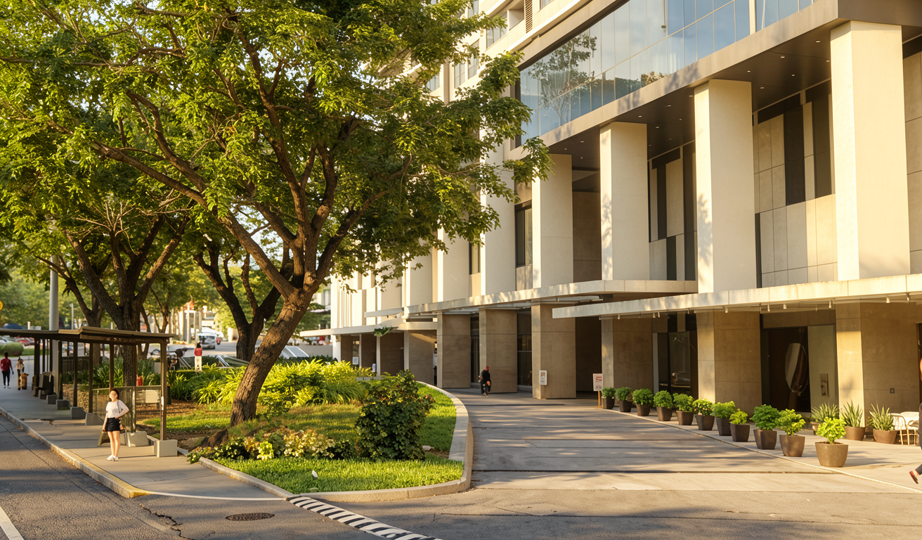 ultra realistic architectural visualization of a modern outdoor patio bar natural warm golden hour sunlight no artificial lighting the ceiling features a matching warm wood deck texture walls are finished in a sophisticated super dark grey stucco modern furniture in high quality grey fabric decorative elements include hyper realistic lush plants and minimalist sculptures 8k resolution cinematic composition photorealistic textures soft shadows realistic gym machines and a cash cod no plants inside the gym window between gym and garden realistic stucco texture and darker gray no artificial lightning beige florr