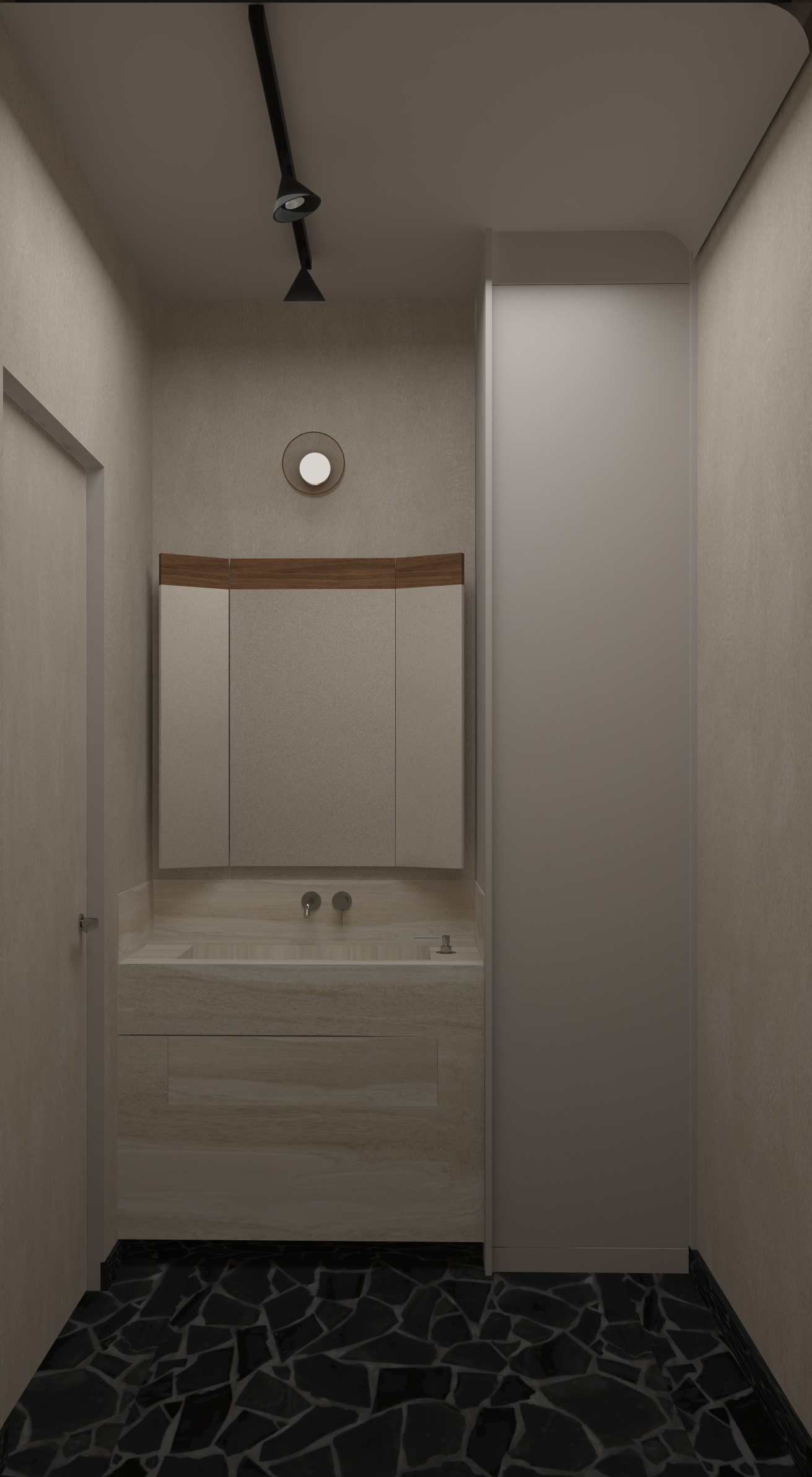 apply neutral artificial overhead lighting only soft ceiling mounted light sources evenly distributed no daylight no windows as light sources lighting should be clean balanced and realistic similar to professional architectural studio lighting