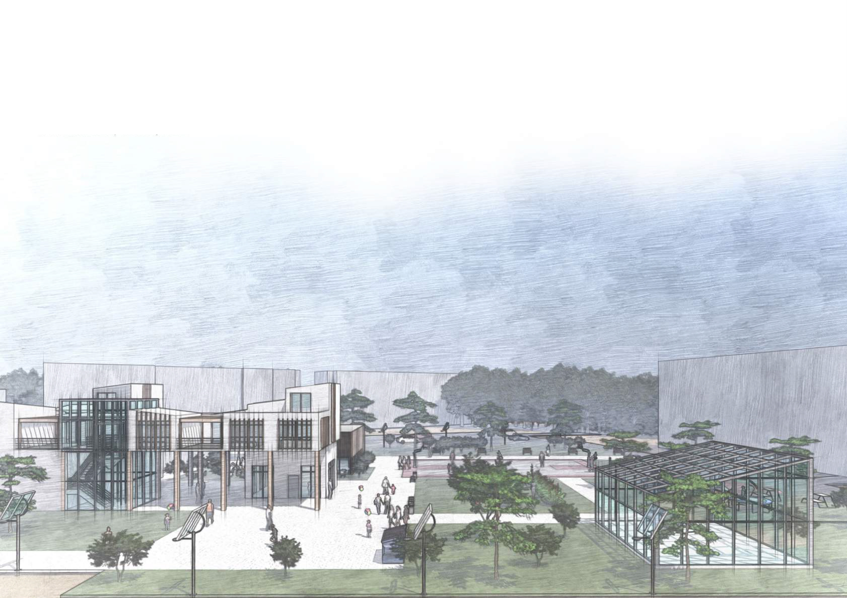 a photorealistic aerial perspective rendering of a contemporary architectural campus complex the scene features a two story modern building with a curved glass facade exposed steel columns and floor to ceiling glazing on the left connected to lower pavilion structures to the right a steel framed greenhouse or pergola structure with a transparent roof sits beside a reflecting pool or water feature the central space is an open plaza with a light colored stone or concrete pathway weaving between manicured lawns mature japanese pine trees and sculpted bonsai style trees punctuate the landscape giving the scene an east asian garden aesthetic small groups of people in casual clothing walk along the pathways the background features a dense tree line in soft gray green tones the sky is overcast with a soft blue white gradient rendered in a delicate pencil and watercolor style with visible cross hatching texture the overall palette is muted pale grays warm whites soft greens and light steel blue the atmosphere is calm cultured and contemplative reminiscent of a japanese art museum or civic cultural center