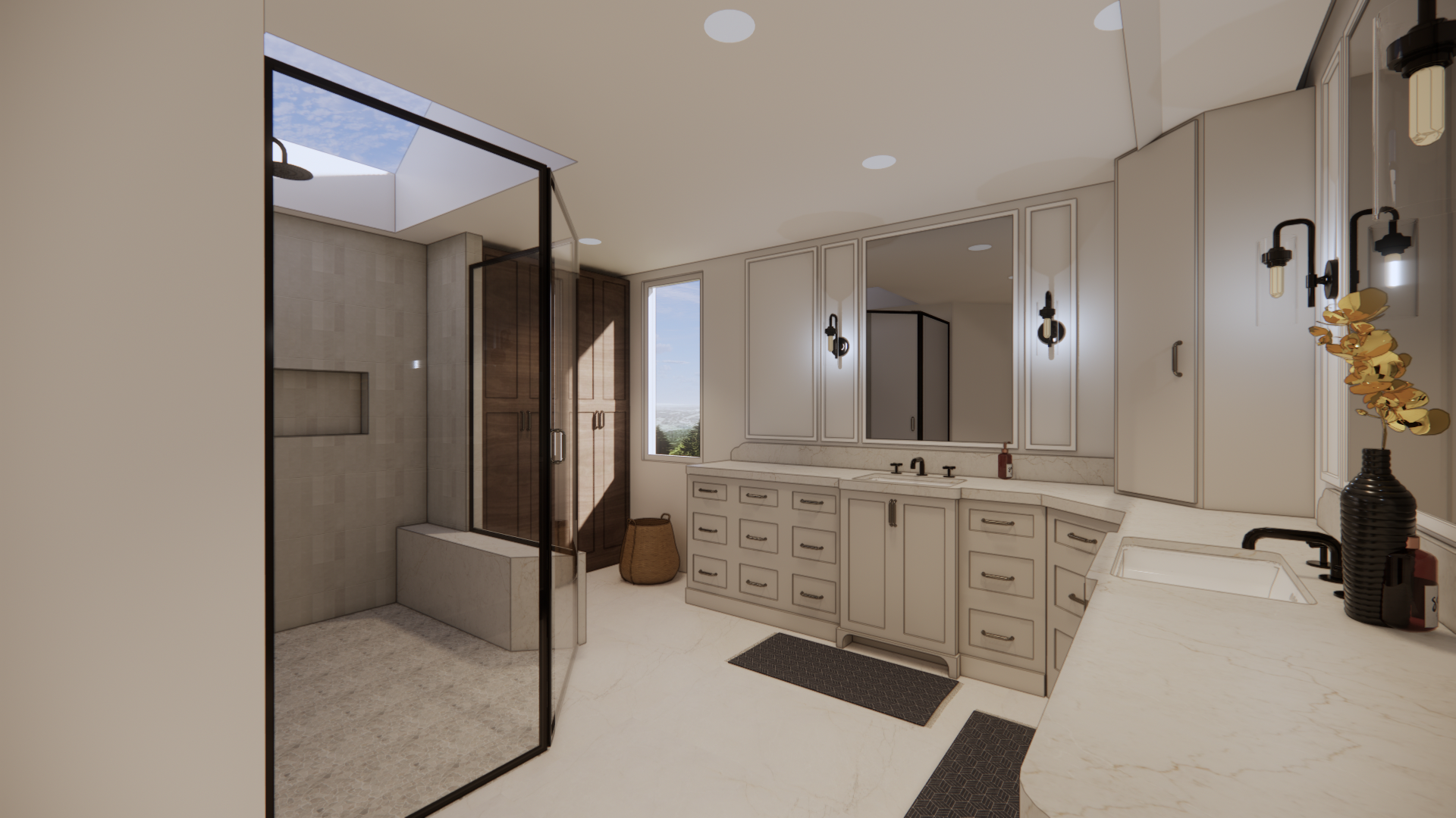 interior shot a modern luxurious bathroom with a transitional and minimalist design the walls are painted in a soft white tone creating a warm inviting atmosphere the cabinetry is sleek with a light taupe finish and brushed nickel handles the countertops are crafted from white marble with subtle gray veining a spacious walk in shower features sandstone tiles and a clear glass door with black accents the floor is covered with light marble tiles complementing the serene environment black wall sconces provide a soft ambient light a skylight allows natural light to flood in enhancing the bright airy atmosphere add splashes of greenery outside the window for a touch of nature the trim around the light fixtures on the wall is a thin delicate picture frame molding the cabinet style is inset shaker with a classic look the wood cabinets by the window are also shaker style there is a single drain in the middle of the shower and the faucets are elegant but modern