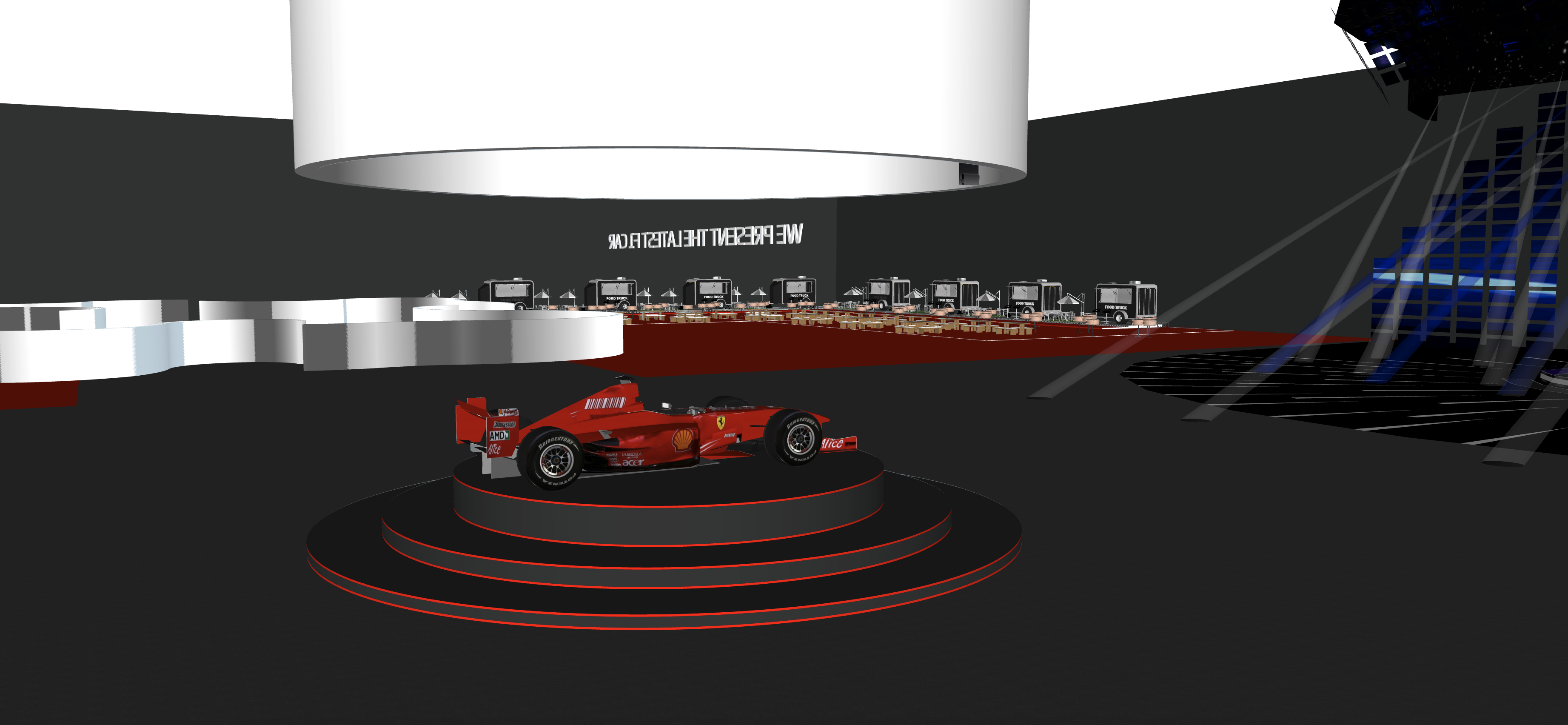 modernist exterior shot render a futuristic car exhibition hall featuring a sleek red formula 1 car on a circular black podium with red accents the background showcases a modern dark gray interior with white smooth curvilinear structures the atmosphere is high tech and dramatic with strategic spotlights and soft ambient lighting include a row of high tech food trucks in metallic silver and soft blue neon lighting creating a sleek modern atmosphere red neon light on the ceiling are a must architecture