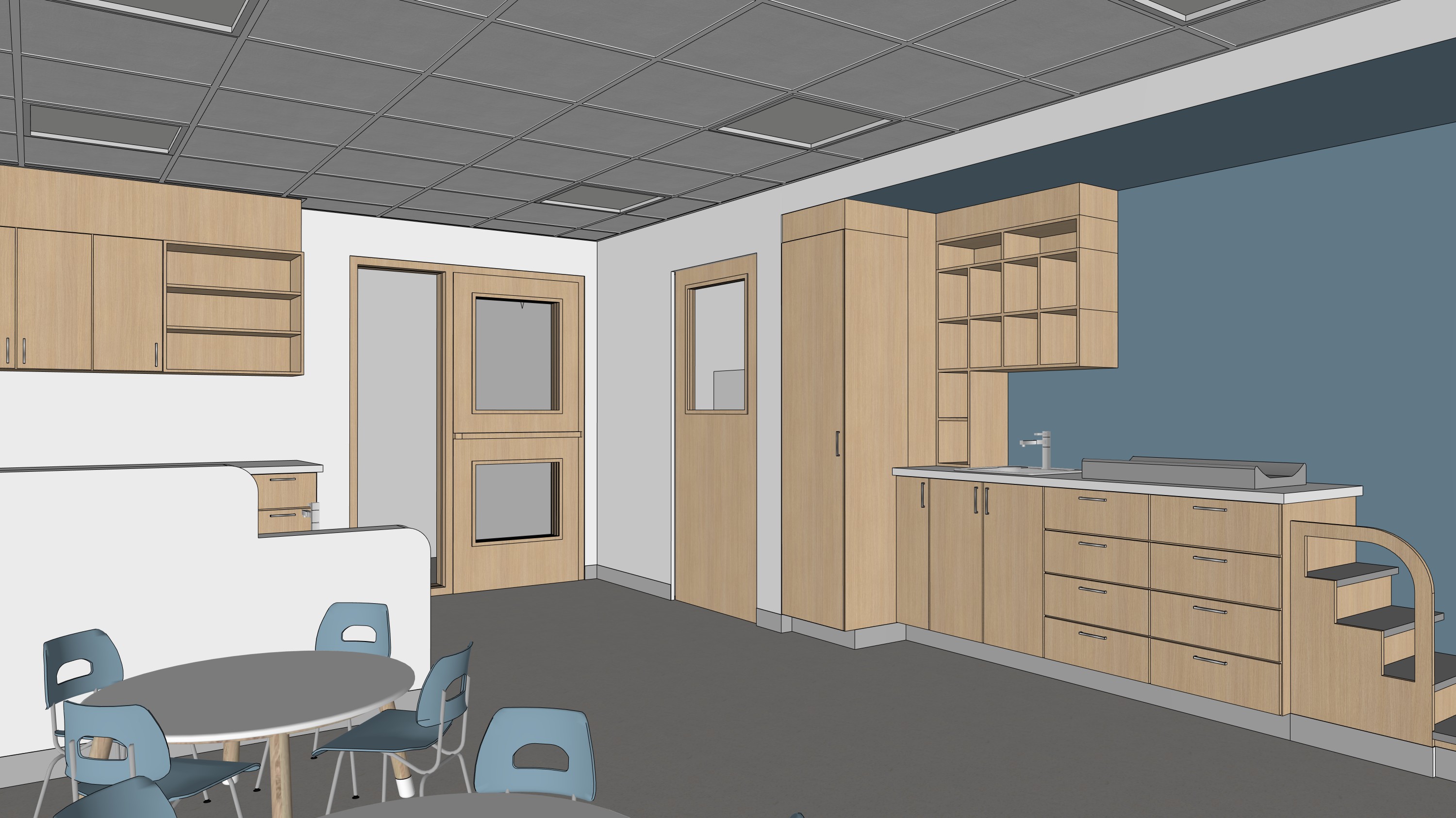 photorealistic architectural interior render of a childcare center cpe based strictly on the provided sketchup image do not add remove or modify any architectural elements furniture openings or layout keep all objects proportions and positions exactly as modeled all existing ceiling light fixtures must be turned on and emit soft realistic illumination combine artificial lighting with natural light if present keeping a balanced and believable exposure preserve the original colors and materials but enhance them with realistic textures accurate material properties and subtle imperfections wood grain fabric softness matte finishes child friendly clean calm and warm atmosphere suitable for a cpe environment realistic global illumination soft shadows correct scale neutral camera perspective no dramatic effects no stylization no artistic interpretation ultra realistic architectural visualization professional quality natural color grading no new furniture no extra decor no change in layout no change in wall positions no change in ceiling design