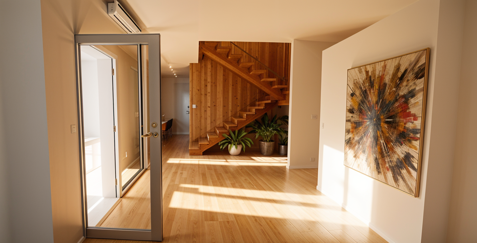 keep image as is but add more sunlight coming in from the left in the far room make right wall taller so that it reaches the ceiling