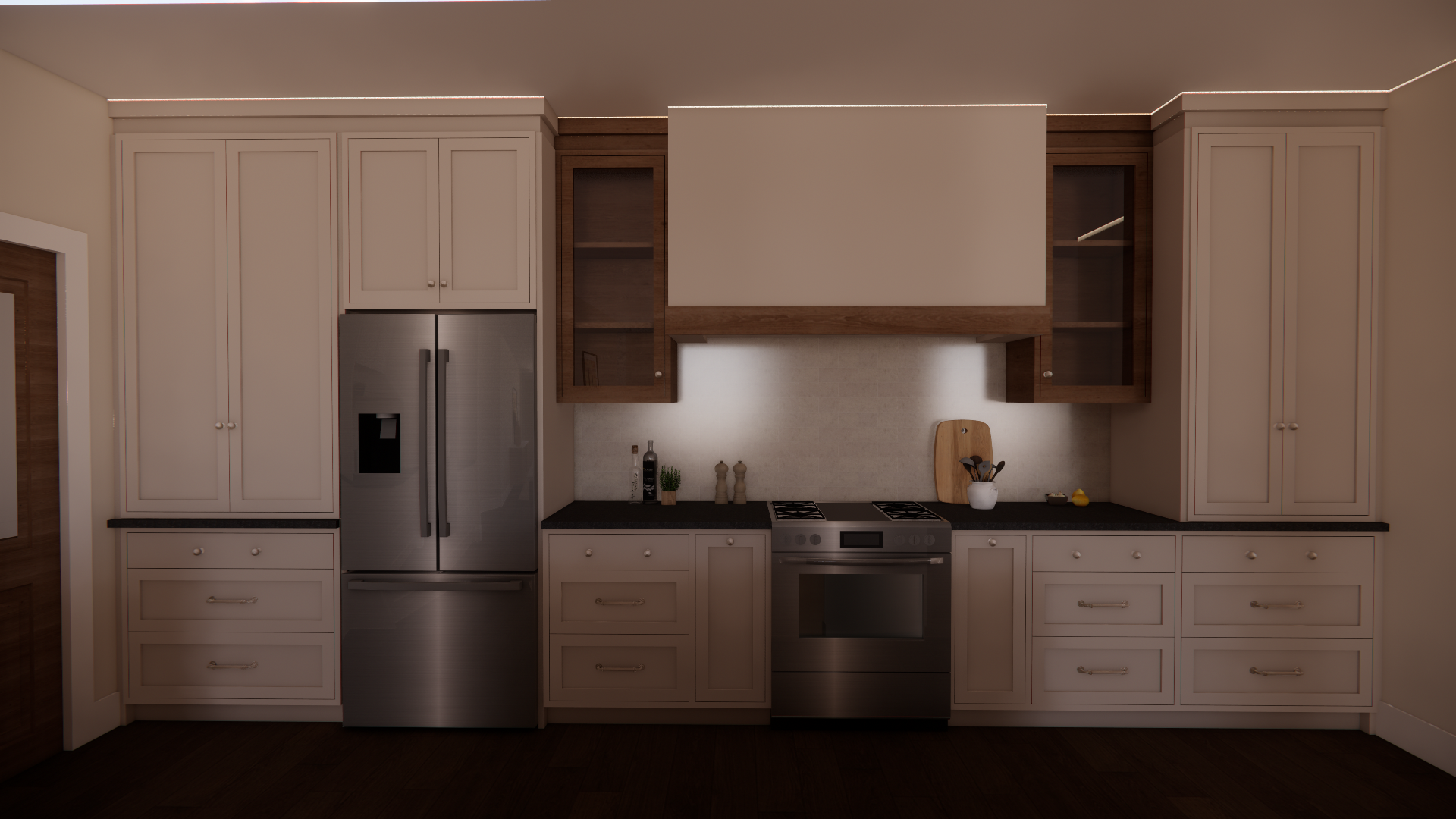 interior shot a photo realistic render of a warm modern european inspired kitchen soft beige shaker style cabinets on the perimeter paired with a warm wood island and white quartz countertop dark wood floors with a matte finish stainless steel appliances and minimalist brass hardware subtle stone backsplash and a custom plaster style range hood with warm wood trim two upholstered counter stools at the island under cabinet and ceiling lighting softly illuminate the space the atmosphere is clean inviting and refined styled with minimal countertop decor shot with soft morning light from south facing windows architecture